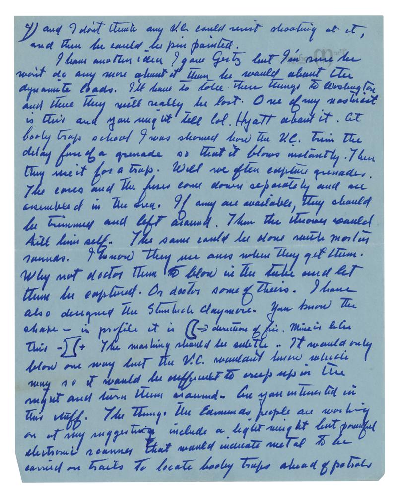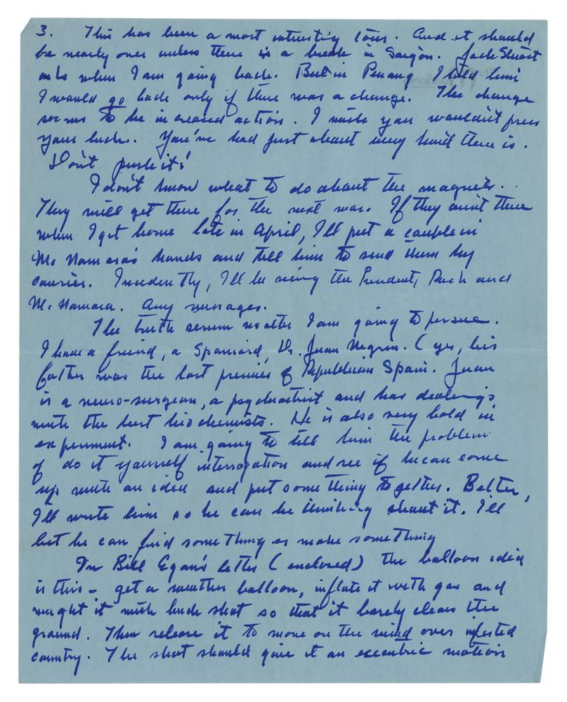 The truth serum matter I am going to pursue. I have a friend, a Spaniard, Dr. Juan Negrin. (yes, his father was the last premier of Republican Spain). Juan is a neuro-surgeon, a psychiatrist and has dealings with the best biochemists. He is also very bold in experiment. I am going to tell him the problem of do it yourself interrogation and see if he can come up with an idea and put something together. Better, I’ll write him so he can be thinking about it. I’ll bet he can find something or make something. In Bill Egan’s letter?the balloon idea is this—get a weather balloon, inflate it with gas and weight it with buck shot so that it barely clears the ground. Then release it to move on the wind over infested country. The shot should give it an eccentric motion and I don’t think any V.C. could resist shooting at it, and then he could be pinpointed. I have another idea I gave Gertz but I am sure he won’t do any more about it than he would about the dynamite loads. I’ll have to take these things to Washington and there they will really be lost. One of my nastiest is this and you might tell Col. Hyatt about it. At booby trap school I was showed how the VC trim the delay fuse of a grenade so that it blows instantly. Then they use it for a trap. Well we often capture grenades. The cores and the fuses come down separately and are assembled in the area. If any are available, they should be trimmed and left around. Then the thrower would kill himself. The same could be done with mortar rounds. I know they use ours when they get them. Why not doctor them to blow in the tube and let them be captured. Or doctor some of theirs. I have also designed the Steinbeck Claymore. You know the shape—in profile it is ((+ direction of fire. Mine is like this -) (+ The marking should be subtle. It would only blow one way but the V.C. wouldn’t know which way so it would be sufficient to creep up in the night and turn them around. Are you interested in this stuff. The things the Edmunds people are working on at my suggesting include a lightweight but powerful electronic scanner that would indicate metal to be carried on trails to locate booby traps ahead of patrols.