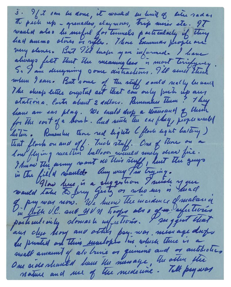 Now here is a suggestion I wish you would take to Jerry Gertz or who ever is head of psy war now. We know the incidence of malaria in both VC and NVM troops also of infections particularly stomach infections. I suggest that our?psywar message drops be printed and their envelopes in which there is a small amount of brine or quinine and or antibiotics. One side should have the message, the other the nature and use of the medicine. Tell psywar that I am going to write a piece about this and that it would be better if they put it in the works, because they are going to have to when my readers get on their backs?it is the best counter propaganda.