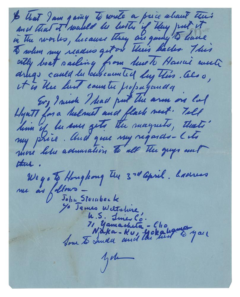 Ev, I wish I had put the arm on Col. Hyatt for a helmet and flack vest. Tell him if he ever gets the magnets, that’s my price. And give my regards—(it’s more like admiration) to all the guys out there. We go to Hong Kong the 3rd of April. Address me as follows—John Steinbeck, c/o James Wiltshire, U.S. Times Co., 71 Yamasheta-Cho, Naka-Ku, Yokohama."
