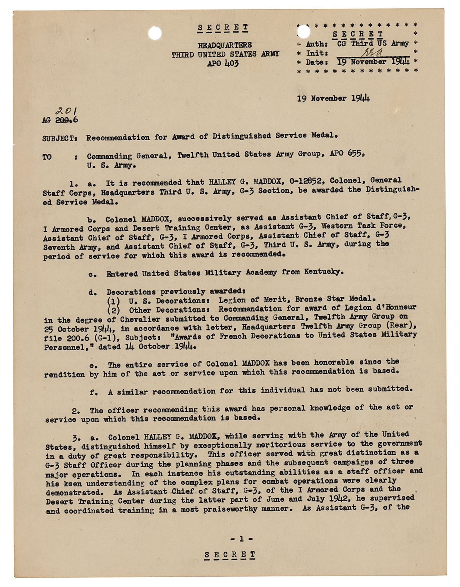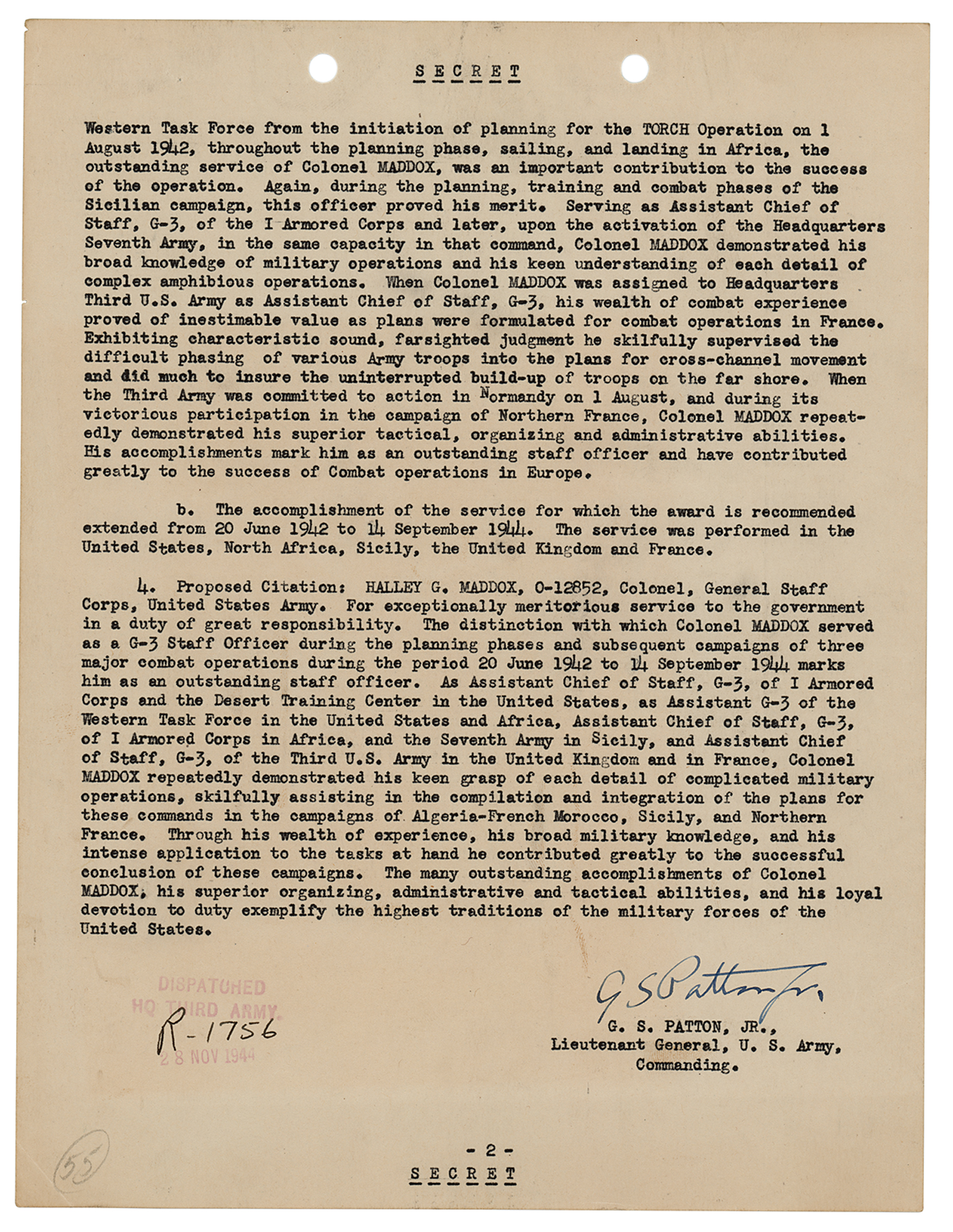 Significant DS, signed “G. S. Patton, Jr.,” two pages marked "Secret" at the top and bottom, 8 x 10.5, November 19, 1944. An official letter from George S. Patton recommending that “Halley G. Maddox, 0-12852, Colonel, General Staff Corps, Headquarters Third United States Army, G-3 Section, be awarded the Distinguished Service Medal.” Below, Patton lists reasons for the commendation, including previously awarded decorations (“Legion of Merit, Bronze Star Medal”) and his experience that led to his nomination, “Colonel Maddox, successively served as Assistant Chief of Staff, G-3, I Armored Corps and Desert Training Center, as Assistant G-3, Western Task Force, Seventh Army, and Assistant Chief of Staff, G-3, Third U.S. Army, during the period of service for which this award is recommended,” which was performed “in the United States, North Africa, Sicily, the United Kingdom and France.” Patton ends the letter with a draft of the proposed citation and then signs neatly at the conclusion. In fine condition.