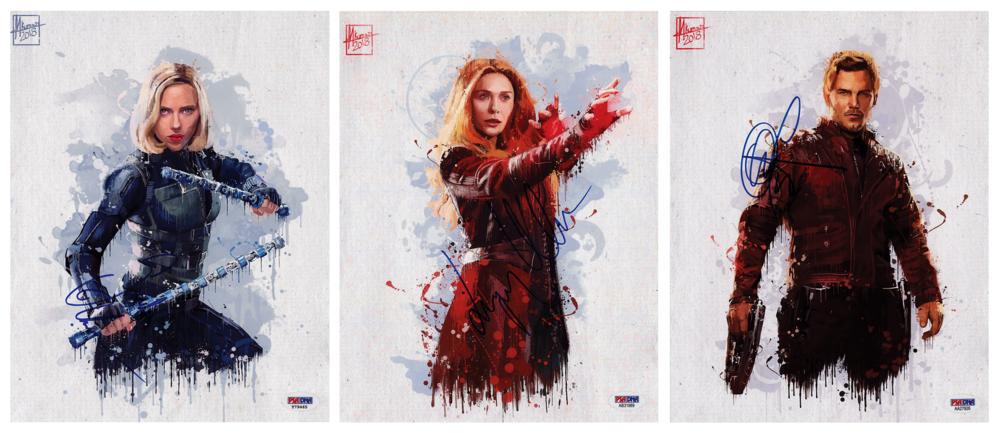 Three color glossy 8.5 x 11 photos of artwork by Mayank Kumar of Black Widow, Peter Quill (Star-Lord), and Wanda Maximoff, characters from the Marvel Comics superhero team The Avengers, individually signed in blue felt tip by Scarlett Johansson, Chris Pratt, and Elizabeth Olsen. In overall fine condition, with PSA/DNA labels affixed to the lower right corner of each (certificates not present).