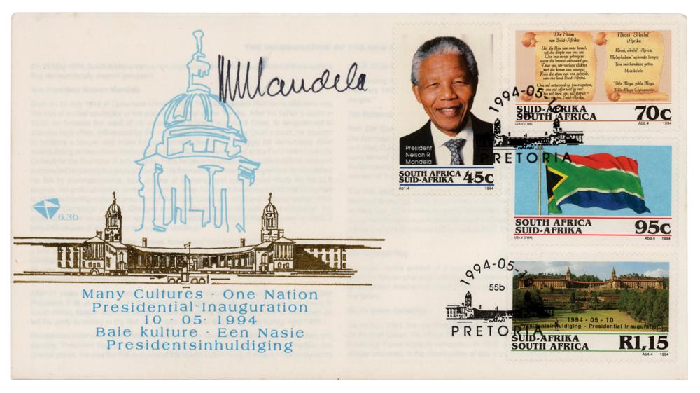 Commemorative cover with a cachet honoring the inauguration of Nelson Mandela on May 10, 1994, signed in black felt tip, "N. Mandela." In very fine condition, with a trivial brush to the first letter of his last name.