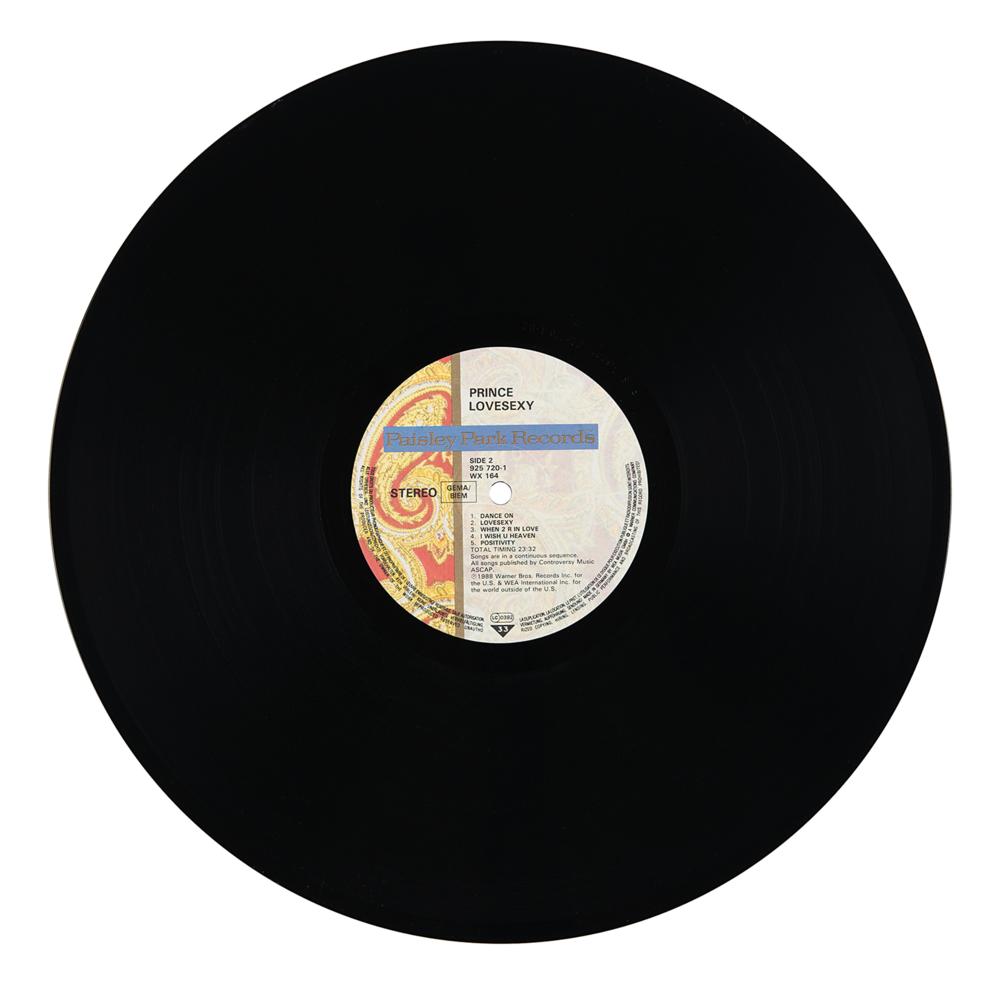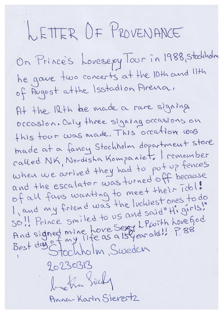 Hugely desirable 1988 UK vinyl pressing of Prince’s 10th studio album, Lovesexy, signed on the front cover in blue felt tip, " 'Love God,' P, '88." In fine to very fine condition. The record is included. Consignor notes that this was signed in Stockholm on August 12, 1988, at a rare autograph signing held at the department store Nordiska Kompaniet (NK) in Stockholm; Prince had performed at Stockholm's Isstadion on August 10th and 11th. Accompanied by a letter of provenance, in part: "I remember when we arrived they had to put up fences and the escalator was turned off because of all fans wanting to meet their idol!...Prince smiled to us and said 'Hi girls!' And signed my Lovesexy LP with love God P. 88. Best day of my life as a 15 year old!"
