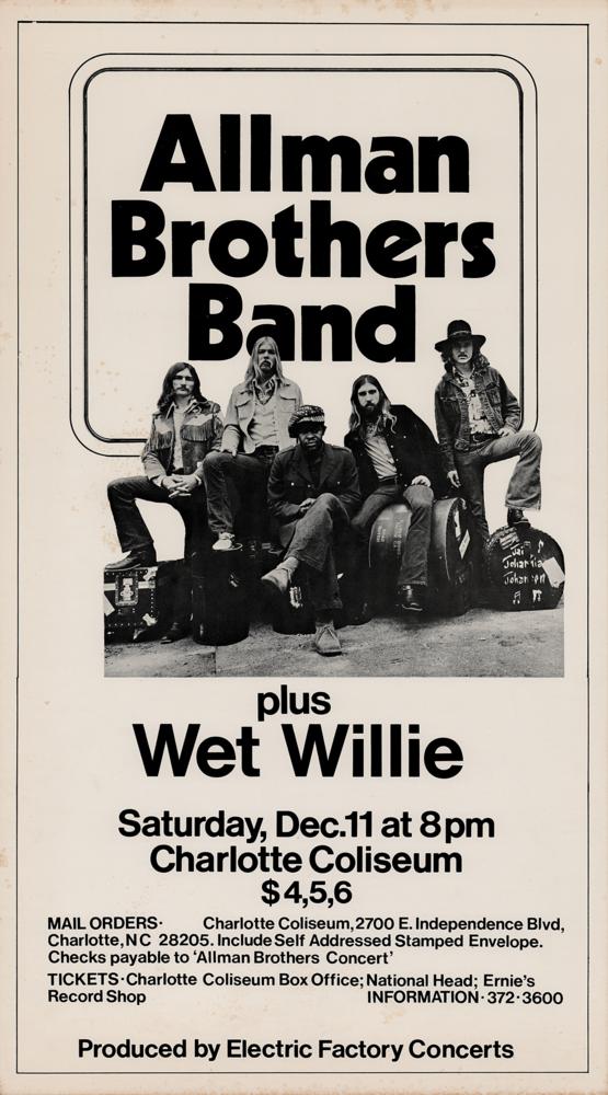 Original black-and-white 13 x 24 concert poster for the Allman Brothers Band plus Wet Willie at the Charlotte Coliseum in North Carolina on December 11, 1971, presented by Electric Factory Concerts. The poster features a classic image of the band by legendary rock photographer Jim Marshall. In fine condition, with some faint edge staining.