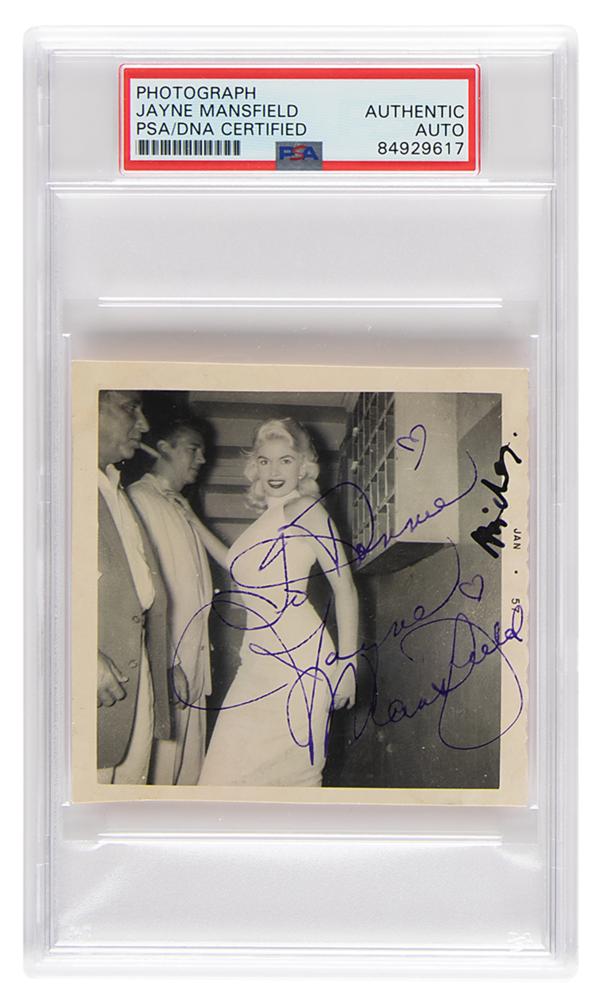 Vintage glossy 3.5 x 3.25 candid photo of Mansfield smiling at the camera and laying a hand on the chest of her husband, Mickey Hargitay, signed and inscribed in purple ink, "To Ronnie, Jayne Mansfield," and in bold black ink, "Mickey.” The right margin is dated to January 1957. In fine condition. Encapsulated in a PSA/DNA authentication holder.