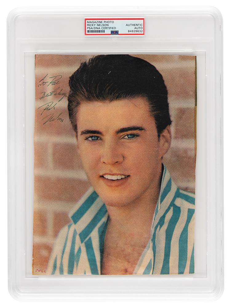 Vintage color 7.25 x 9.75 magazine photo of the blue-eyed teen heartthrob wearing an open striped shirt, signed and inscribed in black ink, "To Rae, Best always, Rick Nelson.” Ink notation to the lower left corner dates the signature to July 1962. In very good to fine condition, with some light creases, and toning and wear to the edges. Encapsulated in a PSA/DNA authentication holder.