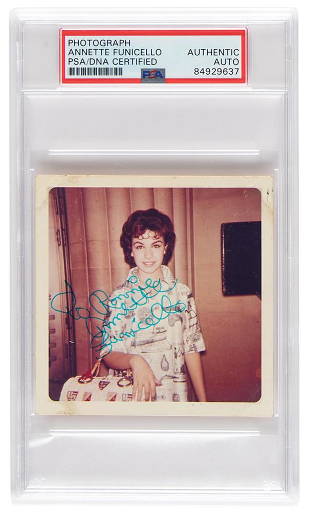 Vintage color glossy 3.5 x 3.5 candid photo of the beloved Mickey Mouse Club member, signed and inscribed in bright blue ink, "To Ronnie, Annette Funicello.” Reverse bears a Kodachrome Print stamp dated to March 1962. In fine condition, with faint corner-mount stains. Encapsulated in a PSA/DNA authentication holder.