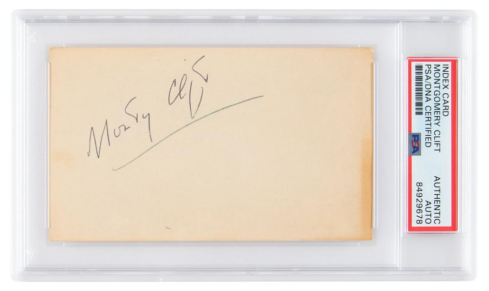 Vintage ballpoint signature, "Montgomery Clift,” on an off-white 5 x 3 card. In fine condition, with light toning along the right edge. Encapsulated in a PSA/DNA authentication holder.