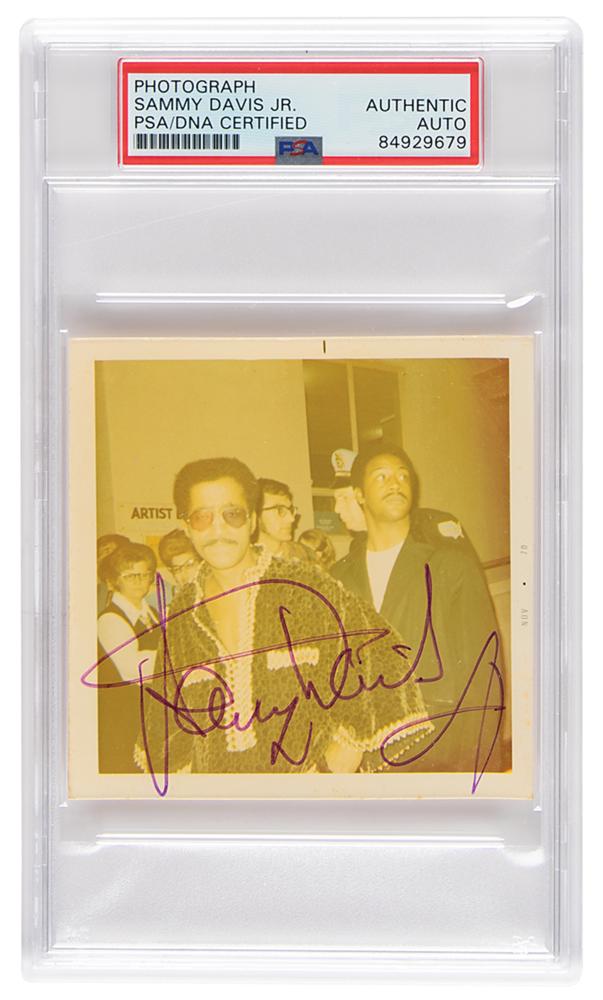 Vintage color glossy 3.5 x 3.5 candid photo of Sammy Davis, Jr. wearing sunglasses and a leopard-print jacket, signed in purple felt tip. The right margin is dated November 1970 and the reverse bears "A Kodak Paper" watermarks. In fine condition. Encapsulated in a PSA/DNA authentication holder.