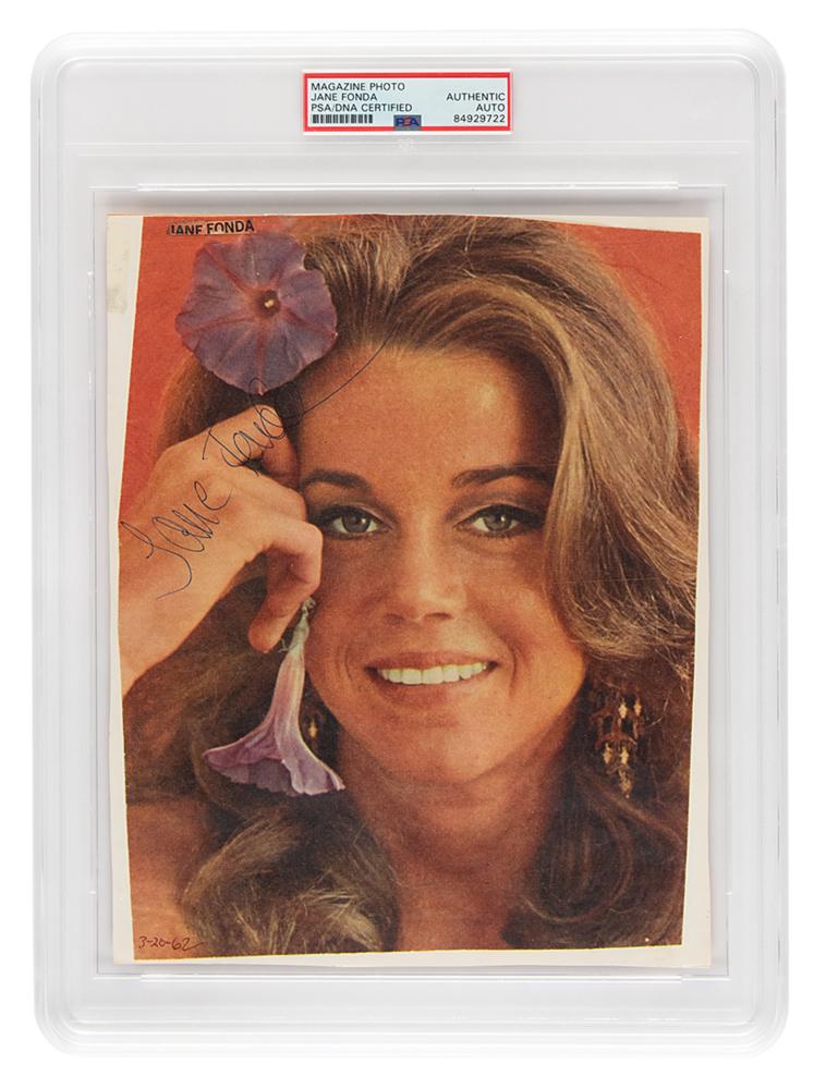Vintage color 7.5 x 9.5 magazine photo of the beautiful actress in an early up-close pose with a flower in her hair, signed in ballpoint by Jane Fonda. Ink notation to the lower left corner dates the signature to March 1962. Affixed to a slightly larger sheet and in very good to fine condition, with irregularly trimmed edges. Encapsulated in a PSA/DNA authentication holder.