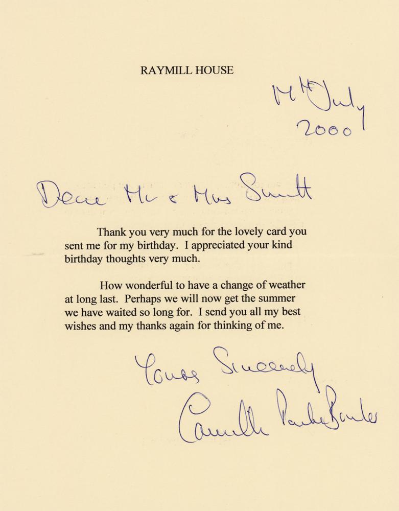 TLS signed “Yours sincerely, Camilla Parker Bowles,” one page, 6.25 x 8, Raymill House letterhead, July 17, 2000. Letter sending thanks for birthday wishes, in part: "Thank you very much for the lovely card you sent me for my birthday. I appreciated your kind birthday thoughts very much. How wonderful to have a change of weather at long last. Perhaps we will now get the summer we have waited so long for." In fine condition.