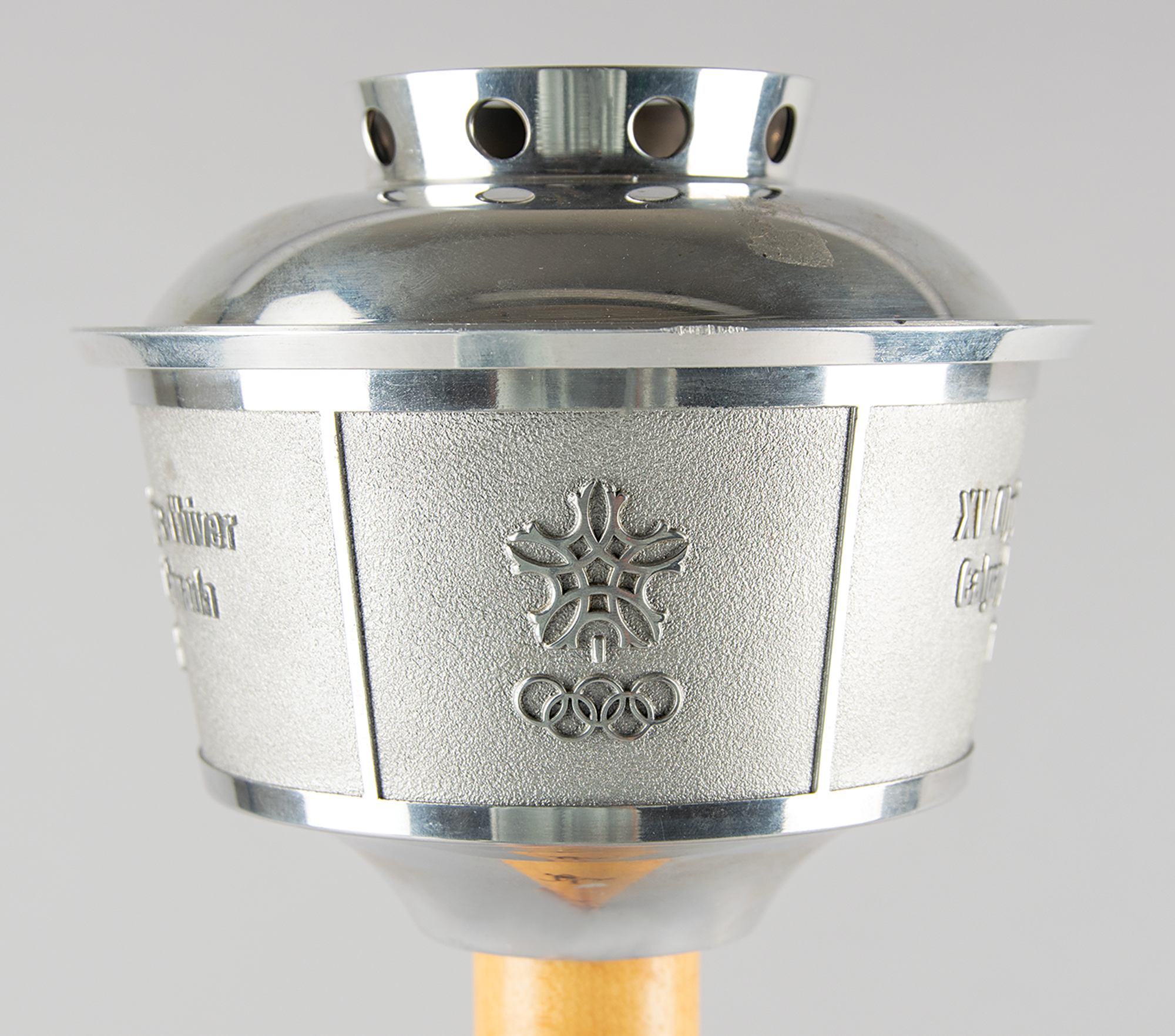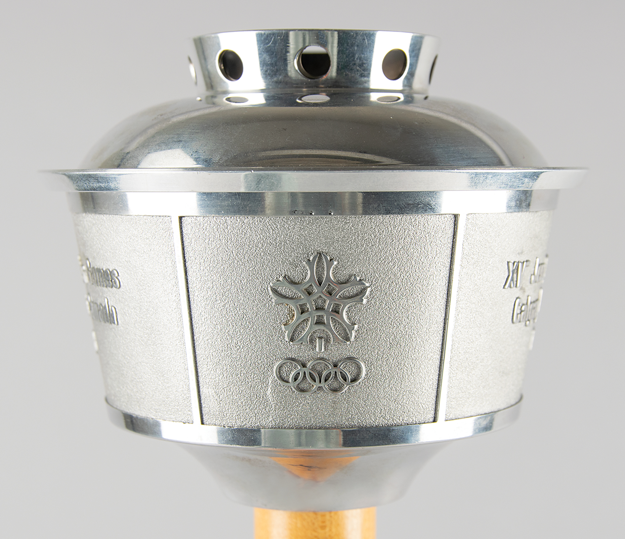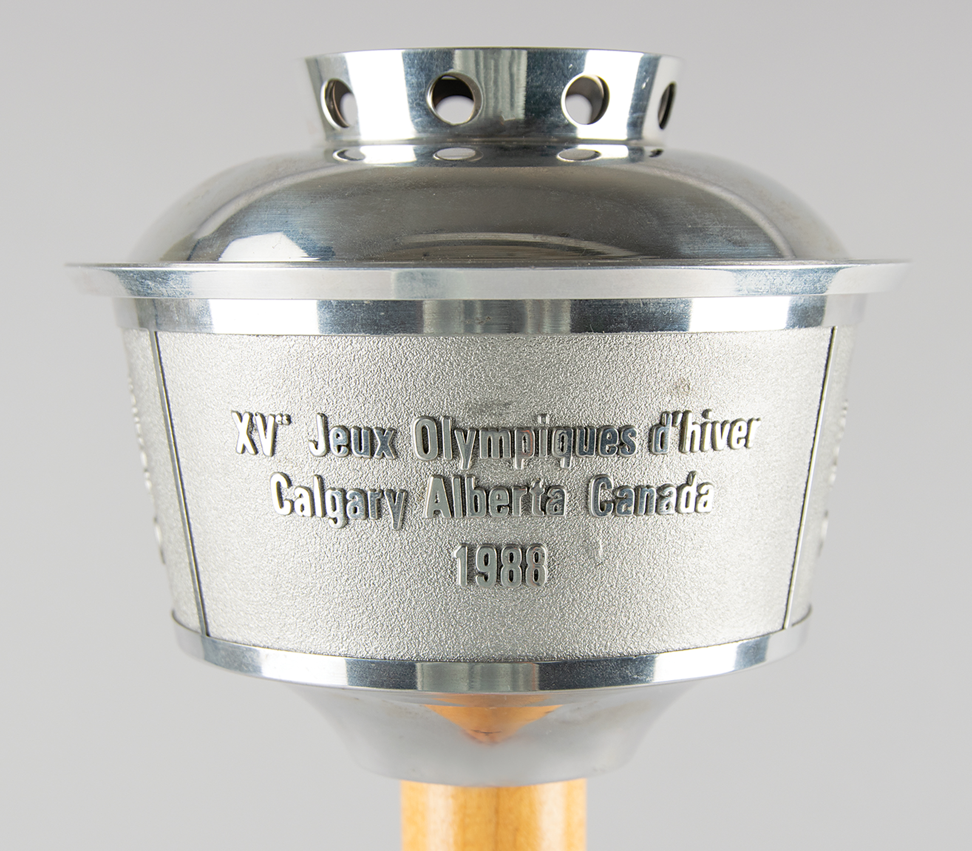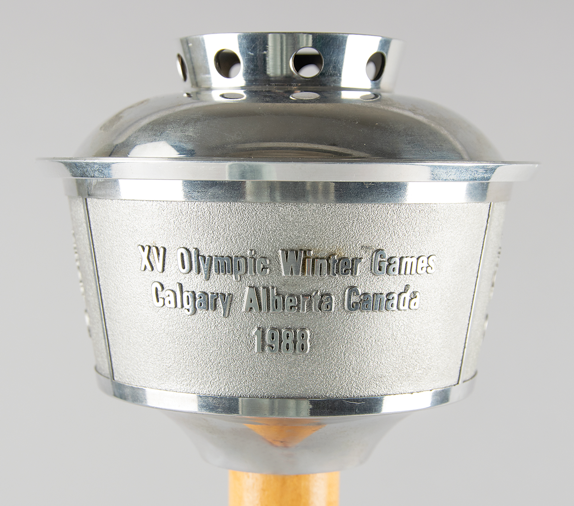 Official 1988 Calgary Olympics torch, comprised of aluminum with a maple handle, measuring 23.5″ in length, emblazoned on the handle with pictograms of ten Winter Olympic sports. The top is inscribed, “XV Olympic Winter Games Calgary Alberta Canada 1988,” and the ball at the bottom is engraved with the Olympic motto, “Citius, Altius, Fortius.” This unused torch, which is missing its fuel canister with wicks, bears trivial hints of tarnishing. The torch was designed to resemble the Calgary Tower, an iconic landmark in the Canadian city. The torch relay was an enormous event, with approximately 6,500 torchbearers drawn from an application pool of over six million. After the lighting ceremony in Olympia, the flame was flown to Newfoundland. The torch traveled 18,000 km through Canada over 88 days. Unlike many relays, the torches were shared and thus only about one hundred were manufactured. An exceptional example of what is one of the most sought-after modern Olympic torches.