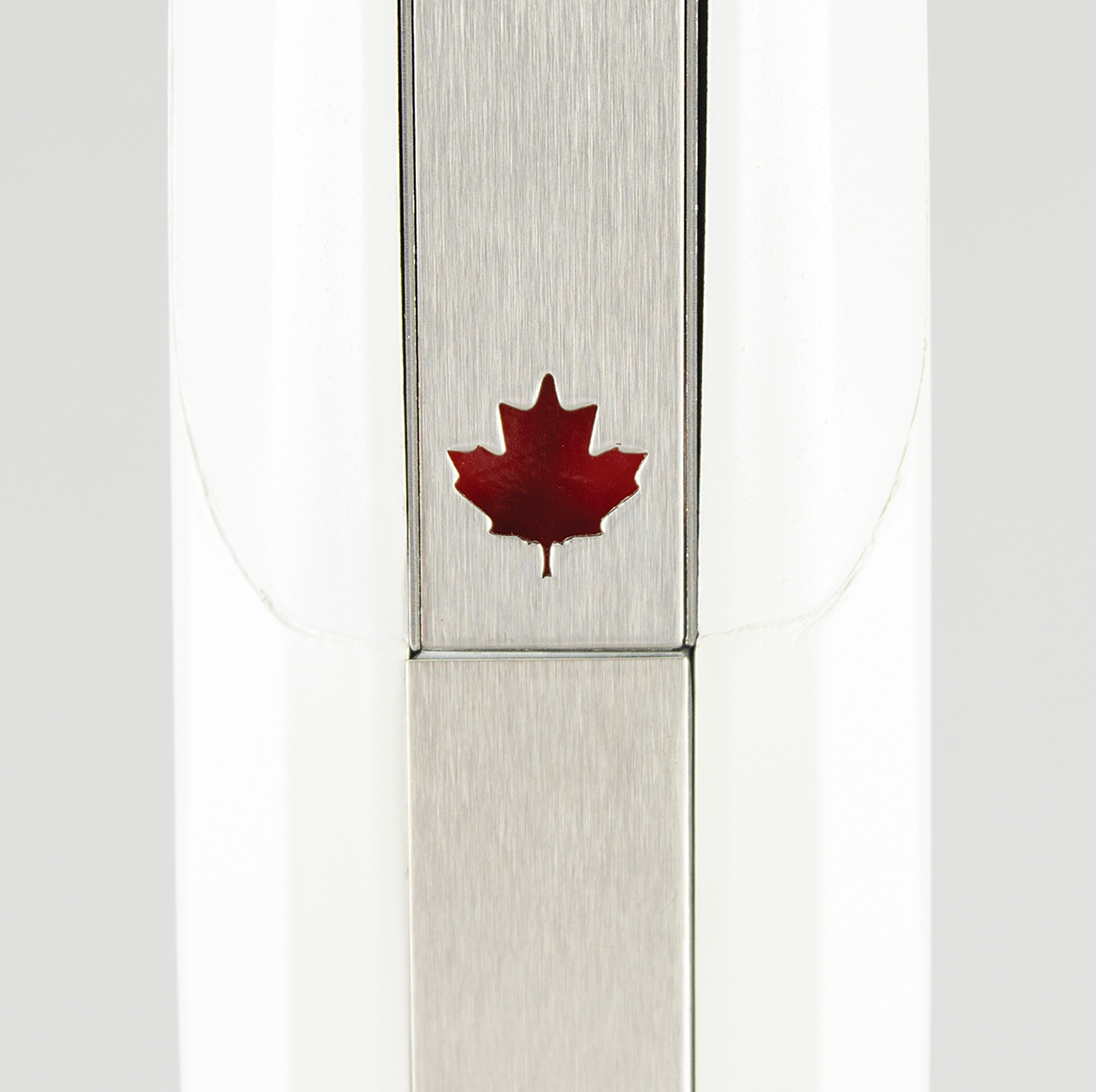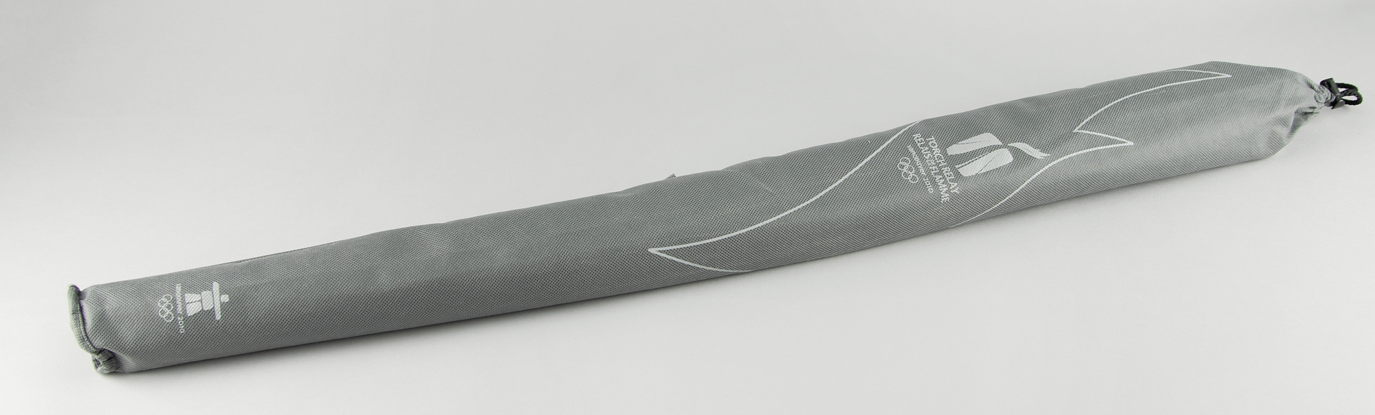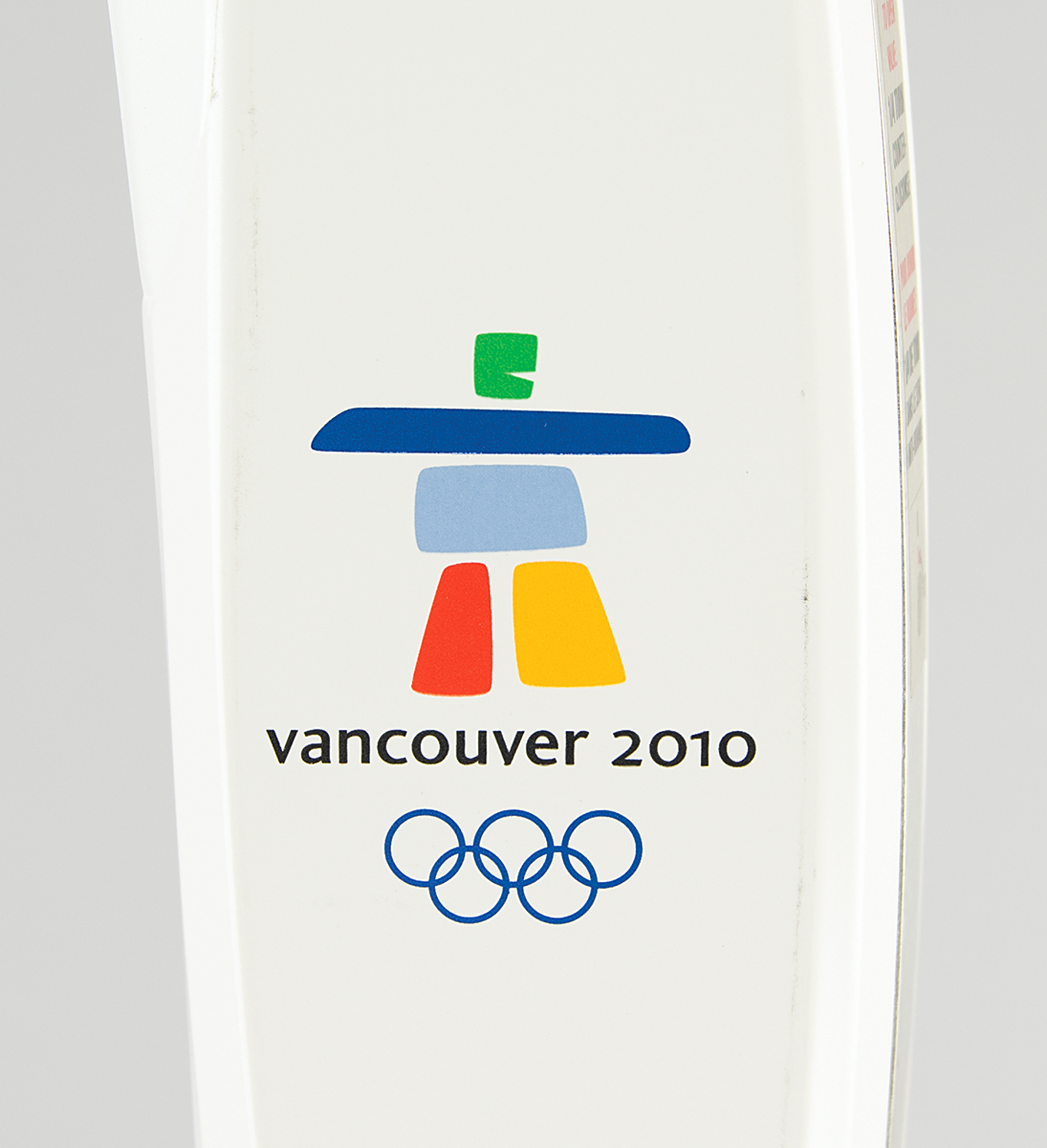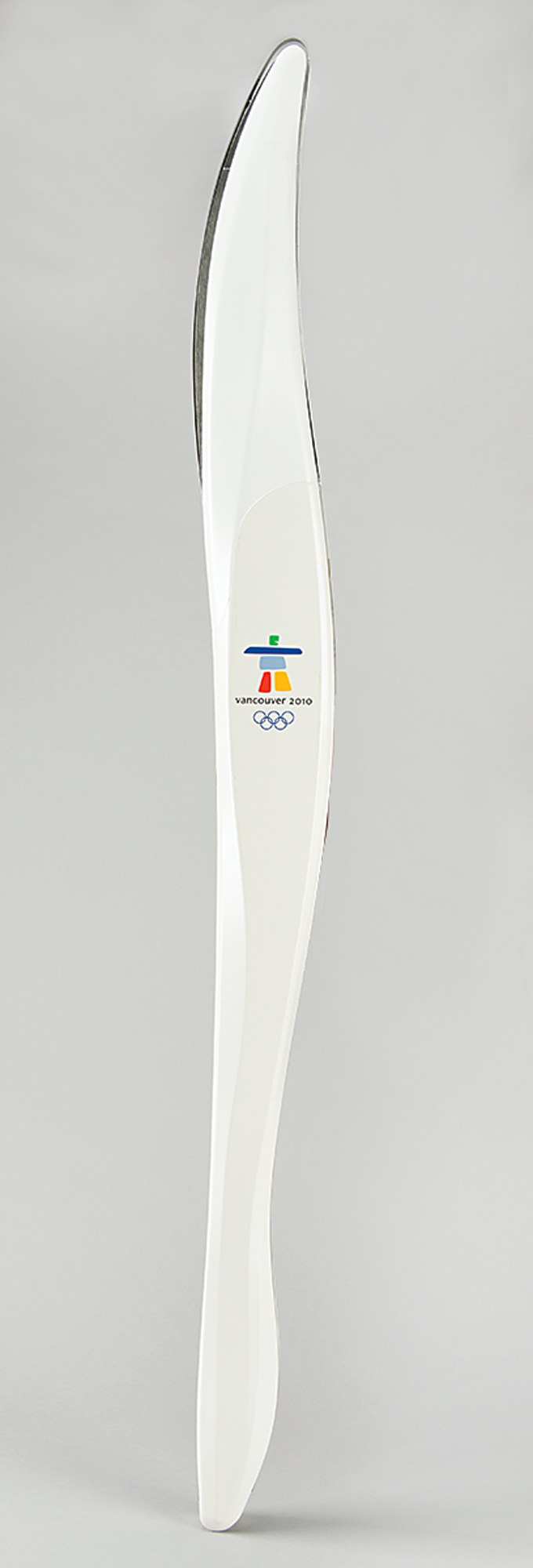 Official Vancouver 2010 Winter Olympics torch that was presented to Canadian Olympic administrator James Worrall. Constructed of stainless steel, aluminum, and sheet molding, the torch measures 37˝ in length and 3˝ at its widest point. Manufactured by Bombardier, the torch features a shape and contours that represent the lines made by snow and ice sports, and it’s engraved with the motto "With Glowing Hearts / Des plus brilliants exploits," with the Canadian maple leaf 'cut-out' on the opposing side. The Vancouver Games logos are present on either white panel, the upper tips of which show slight separation; the body bears a few light scuffs. Complete with its original torch relay carrying bag. The torch was lit in Olympia on October 22, 2009, and from October 30, 2009, until February 12, 2010, the Olympic Flame was carried by over 12,000 runners for over 100 days over a course of 45,000 km of Canadian soil—the longest national relay ever held.