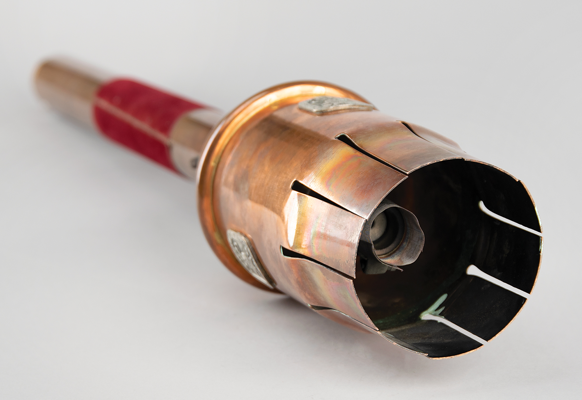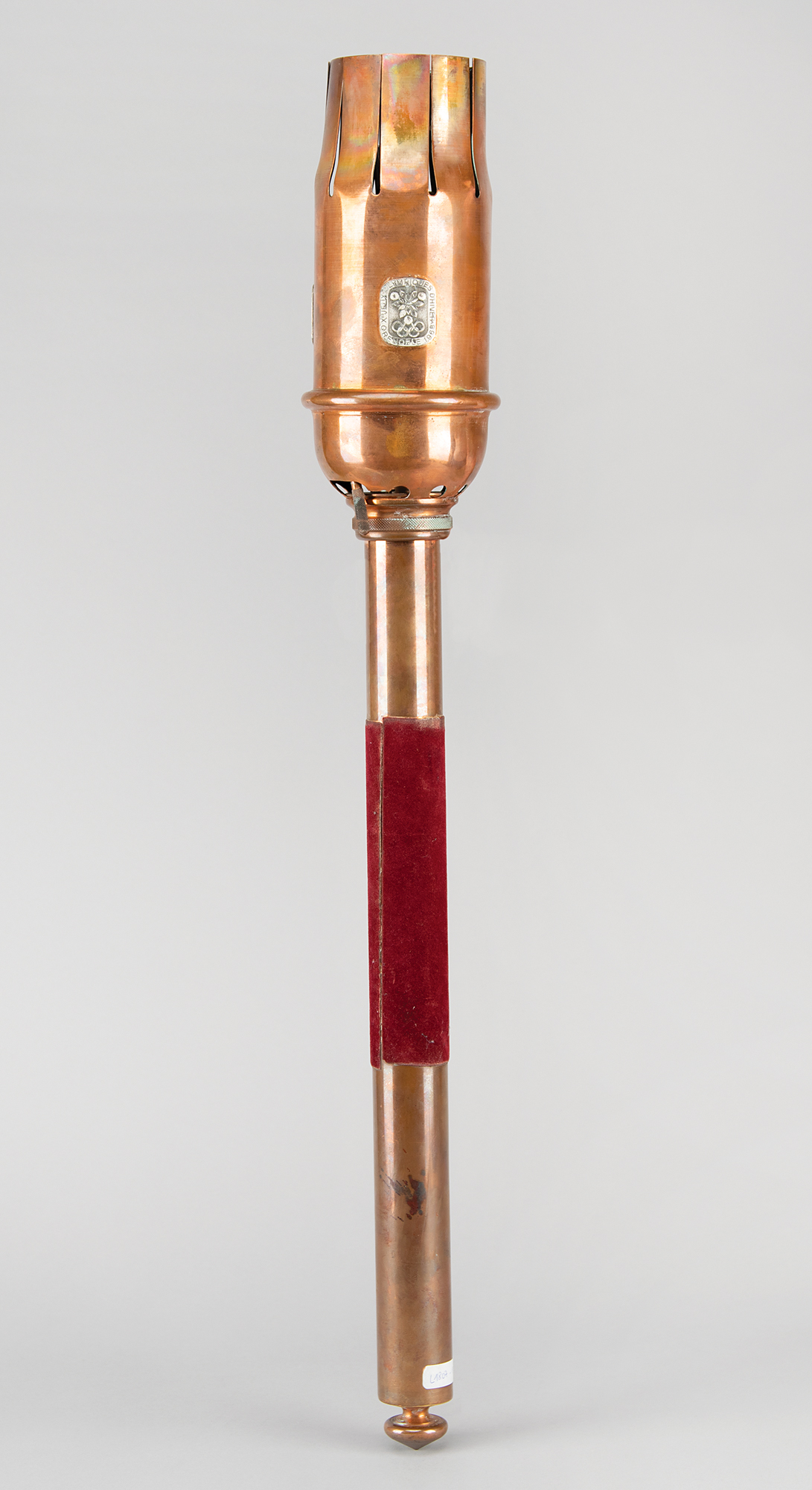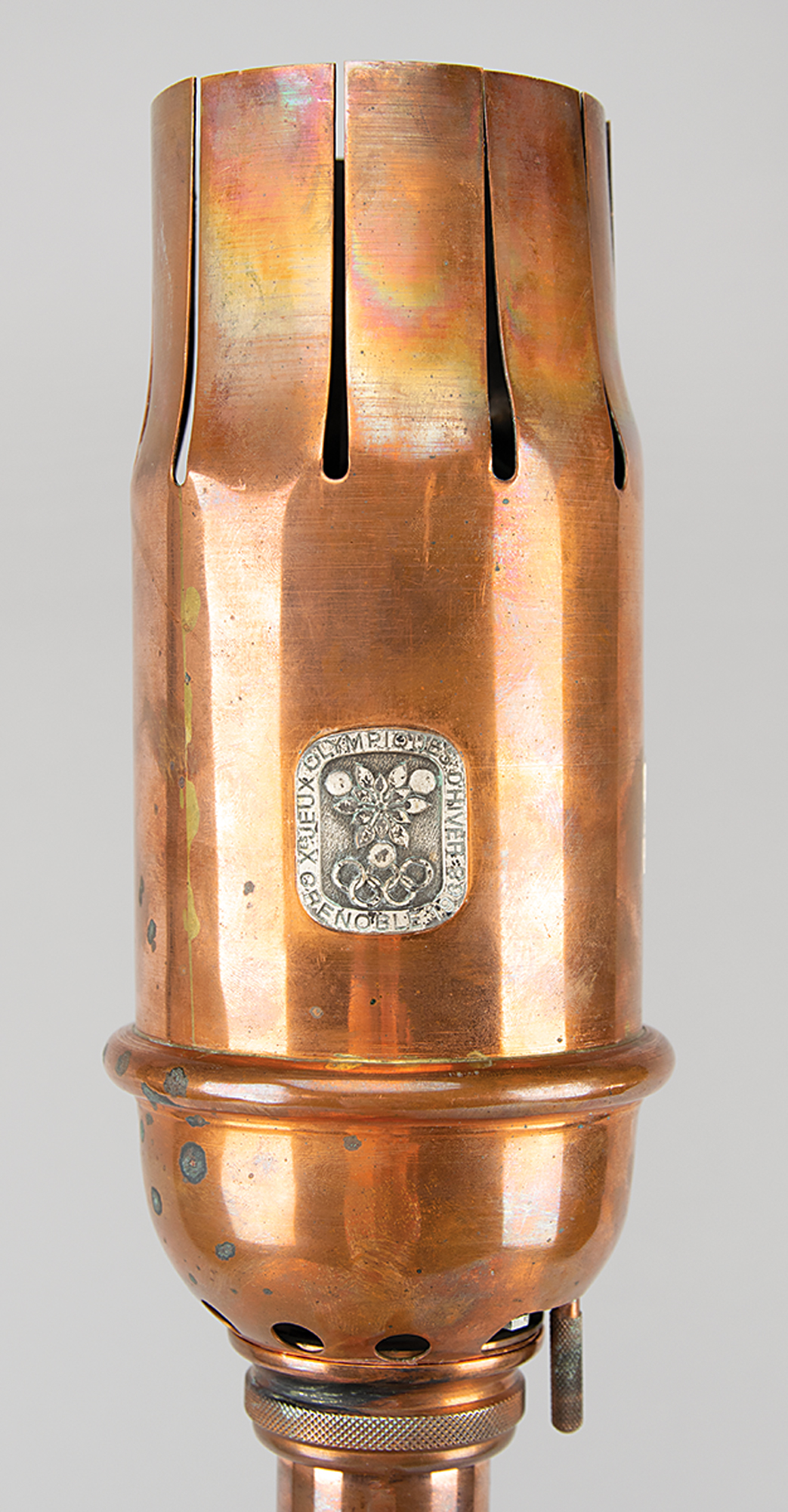 Excessively rare official torch of the Grenoble 1968 Winter Olympics. One of just 33 manufactured by the Société Technique d'Equipement et de Fournitures Industrielle (STEFI), the torch is comprised of a handsome rose-gold bronze alloy with a red felt-wrapped grip. It measures 30˝ in length, 4˝ at its widest point, and weighs 3.6 lbs. The torch features a long, narrow combustion chamber with a crenelated upper section representing the flame. The sides of the burner head are decorated with three silver plaques featuring the Grenoble emblem designed by Roger Excoffon, depicting the Olympic rings surmounted by a snowflake, and encircled by the text, "Xes Jeux Olympiques d'Hiver, Grenoble 1968.” A small label is affixed to the bottom of the handle and the torch bears areas of oxidation and discoloring. Per the consignor, the original owner of this Grenoble torch installed and managed the gas equipment instrumental to the lighting of the Olympic flame during the opening ceremony. A magnificent opportunity to claim one of the rarest and most sought-after Olympic torches ever made.