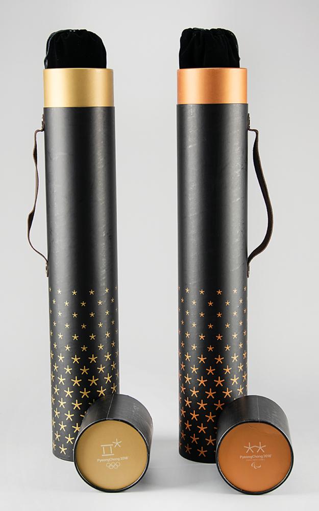Highly appealing pairing of official torches used during the relays of the 2018 PyeongChang Winter Olympics and Paralympics. Both are constructed of a white metal exterior shell, with the Olympic torch bearing a gold-colored metal interior and accents, and the Paralympics torch featuring a bronze-colored metal interior and accents. Both torches measure 27.5″ in length and 3.25″ at their widest point and were designed and manufactured by Young-se Kim, Inno Design / Groupe Hanhwa. At their tops, their exterior shells are divided into five vertical branches to form a pentagonal shape, representing the sporting passion and spirit that unites the five Olympic continents (Africa, Europe, the Americas, Asia, and Australia). The bodies of each torch boast a raised emblem of their respective games, and their handles are printed with either golden or bronze stars; the bottom of the Paralympics handle bears an affixed label numbered “205-004." Both torches bear evidence of onetime exposure to the Olympic flame, and the bottom of the Olympics torch handle has some adhesive residue. The 700-millimeter length of the torches represents the altitude of PyeongChang, which lies 700 meters above sea level. The torches are specially designed so that the flame can burn continuously despite inclement weather; they do this by generating an air tunnel that sends more oxygen to the flame, and a pentagonal hole at the bottom of each torch allows water to drain. Both are completed by their velvet drawstring bags and attractive matching carrying tubes, which bear slight wear and creases. An ideal and stunning set of Olympic torches commemorating the first Korean Winter Olympics and Paralympics.