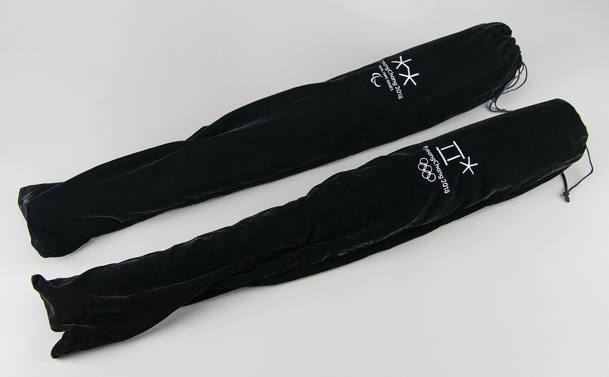 Highly appealing pairing of official torches used during the relays of the 2018 PyeongChang Winter Olympics and Paralympics. Both are constructed of a white metal exterior shell, with the Olympic torch bearing a gold-colored metal interior and accents, and the Paralympics torch featuring a bronze-colored metal interior and accents. Both torches measure 27.5″ in length and 3.25″ at their widest point and were designed and manufactured by Young-se Kim, Inno Design / Groupe Hanhwa. At their tops, their exterior shells are divided into five vertical branches to form a pentagonal shape, representing the sporting passion and spirit that unites the five Olympic continents (Africa, Europe, the Americas, Asia, and Australia). The bodies of each torch boast a raised emblem of their respective games, and their handles are printed with either golden or bronze stars; the bottom of the Paralympics handle bears an affixed label numbered “205-004." Both torches bear evidence of onetime exposure to the Olympic flame, and the bottom of the Olympics torch handle has some adhesive residue. The 700-millimeter length of the torches represents the altitude of PyeongChang, which lies 700 meters above sea level. The torches are specially designed so that the flame can burn continuously despite inclement weather; they do this by generating an air tunnel that sends more oxygen to the flame, and a pentagonal hole at the bottom of each torch allows water to drain. Both are completed by their velvet drawstring bags and attractive matching carrying tubes, which bear slight wear and creases. An ideal and stunning set of Olympic torches commemorating the first Korean Winter Olympics and Paralympics.