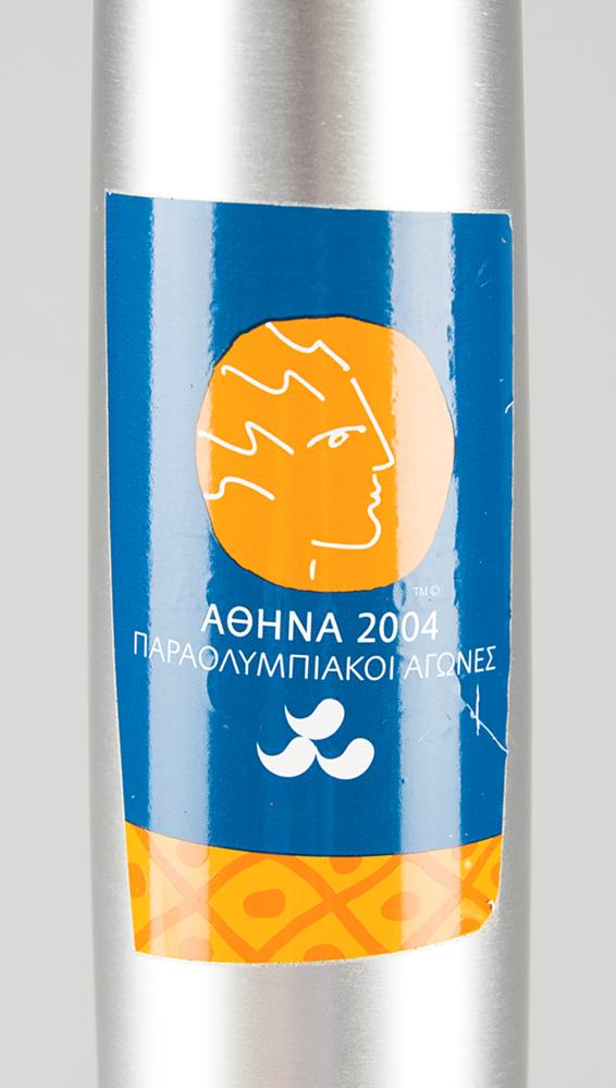 Official 2004 Athens Summer Paralympics torch, constructed of aluminum and olive wood, measuring 25.75″ in length and 2.25″ at its widest point, designed by Andreas Varotsos and manufactured by GA & L Harrington. The torch was modeled to reflect the simple and congruous lines of an olive tree leaf, with the union of wood and metal evoking the different colors found on either side of the leaf, and the ergonomic design representing the extension of the moving flame. The front of the aluminum sheath bears a label of the 2004 Paralympics emblem, which bears a few scratches. The Olympic flame was lit in Olympia, Greece, on September 17, 2004, and a total of 705 torchbearers carried the Paralympics flame 410 km through 45 municipalities of Greece.