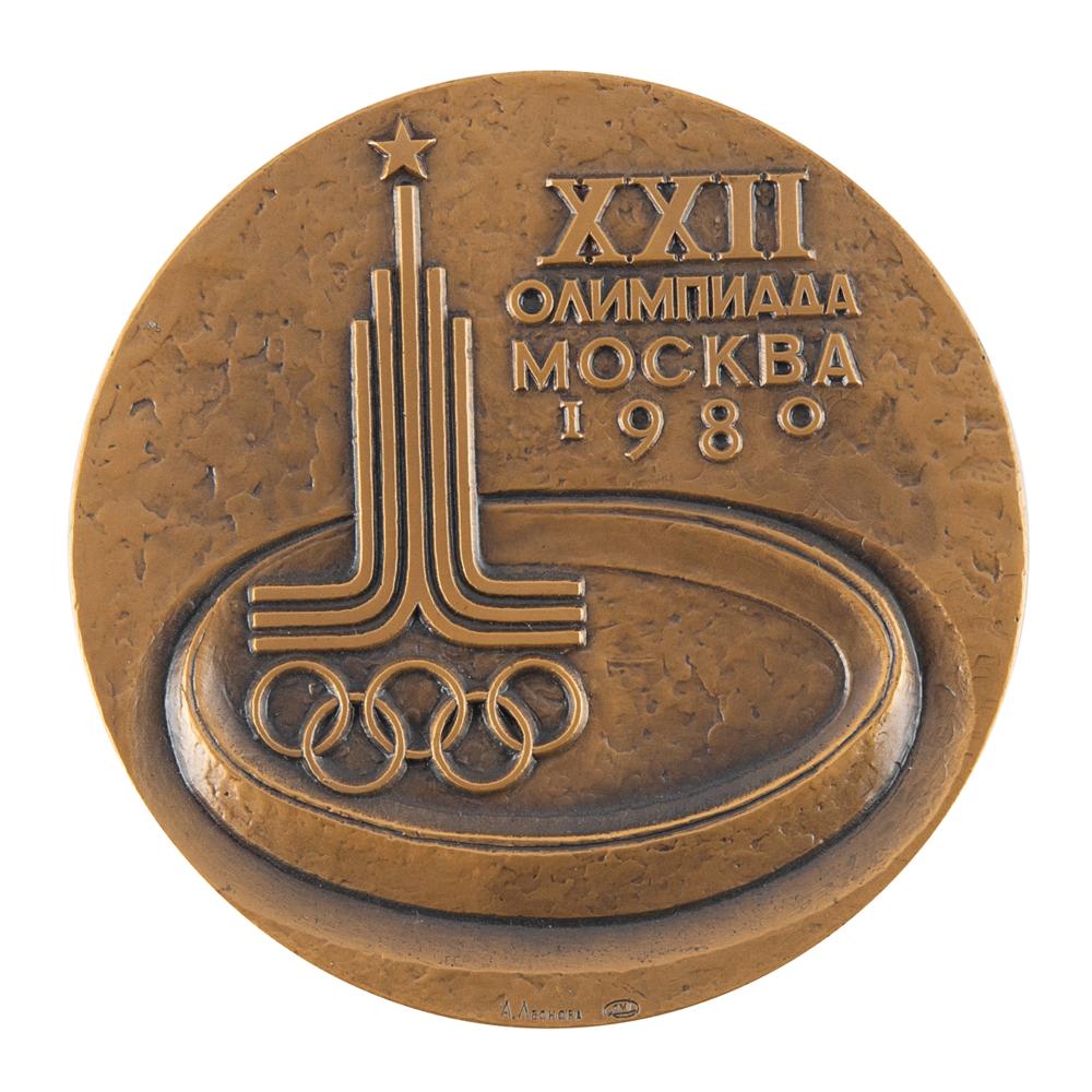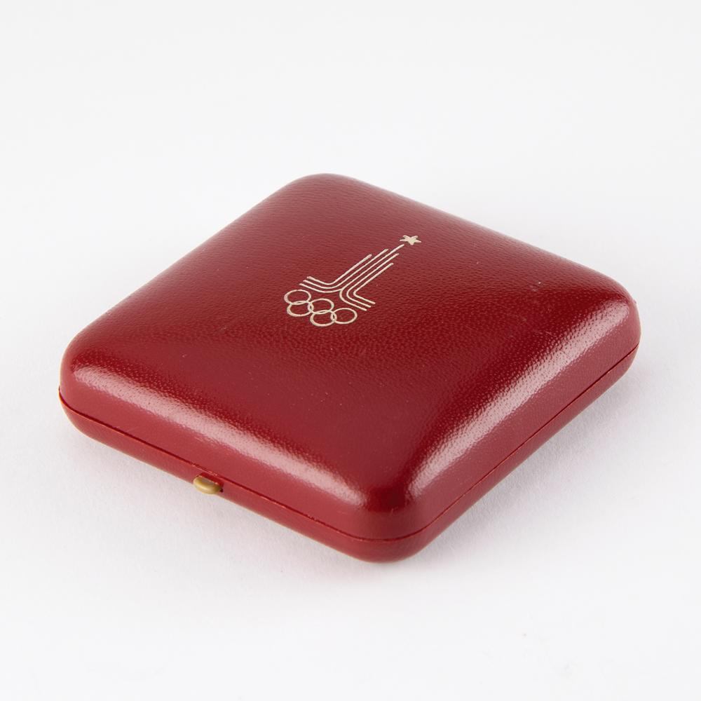 A participation medal issued for the Moscow 1980 Summer Olympics. Tombac, 60 mm, 125 gm, by Angelina Leonova. The front features the Moscow Games emblem above the Olympic stadium and raised Cyrillic lettering; the reverse bears a handsome detailed view of the Red Square in Moscow. Includes its original red case.