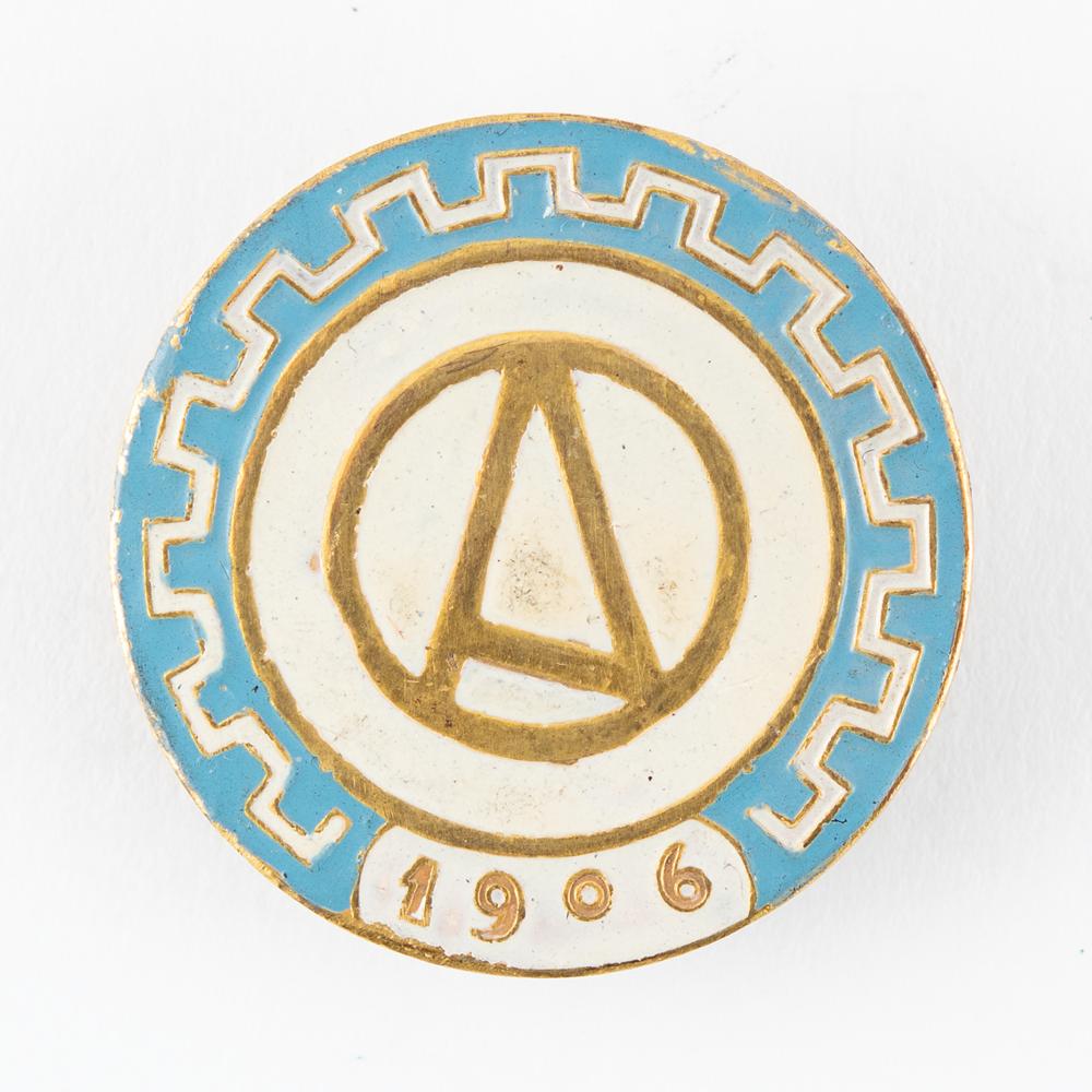Rare athlete's badge issued for the Athens 1906 Intercalated Olympics. Gilt bronze, 36 mm in diameter, featuring an enameled light blue ancient Greek motif in the border, with white enamel circular center surrounding the gilt "A." Mounted with a golden safety pin on the reverse. The 1906 Games in Athens were considered the Olympics by the press and participants, which included 854 athletes from 20 countries. As they were never officially sanctioned by the International Olympic Committee, they are given the 'Intercalated' nomenclature today. These badges were hand-made by the Hellenic army for the needs of the Olympic Games.