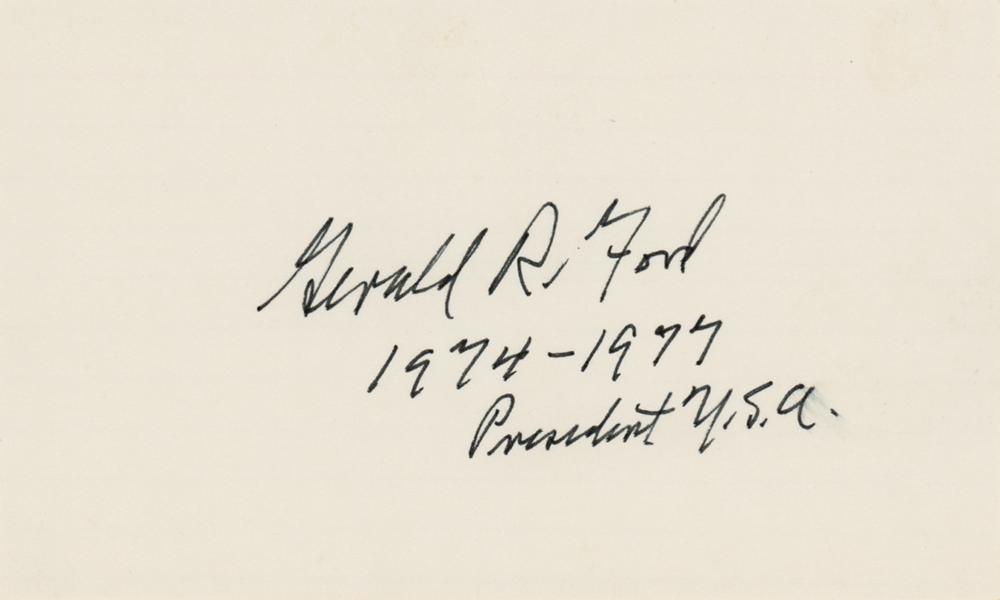 Felt tip signature, "Gerald R. Ford, 1974-1977, President U.S.A.,” on a white 5 x 3 card. In very fine condition.
