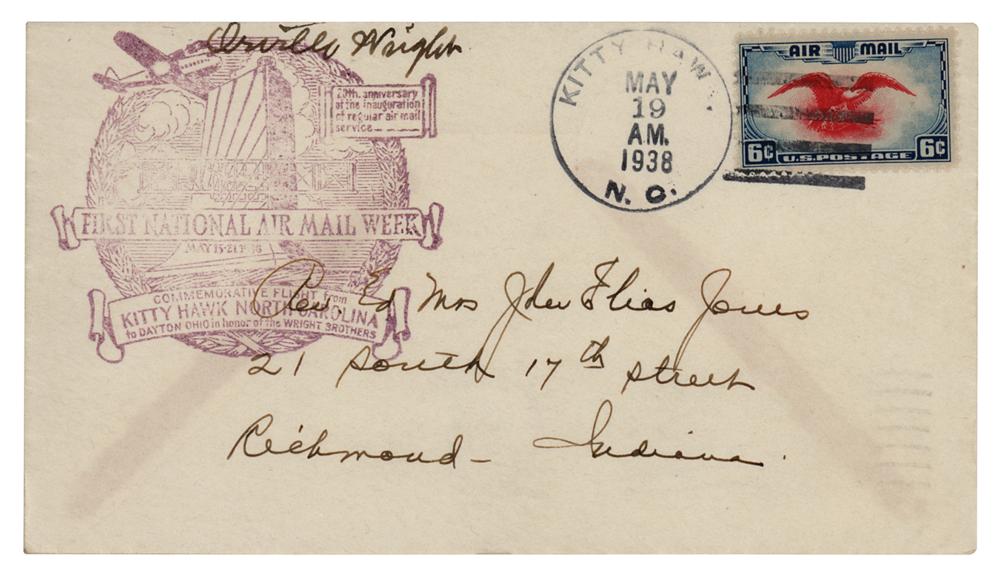 Commemorative cover with a cachet honoring the First National Air Mail Week, postmarked at Kitty Hawk on May 19, 1938, signed at the top in fountain pen, "Orville Wright." Addressed in another hand to a family in Indiana. In fine condition, with light envelope glue stains.