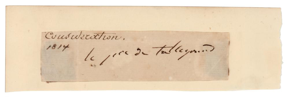 Highly skilled and influential diplomat (1754-1838) who served the French government from the reign of Louis XVI through that of Louis-Philippe. Ink signature, "le pce de talleyrand,” on an off-white 4 x 1 slip. In very good to fine condition, with show-through at the edges from mounting remnants on the back.