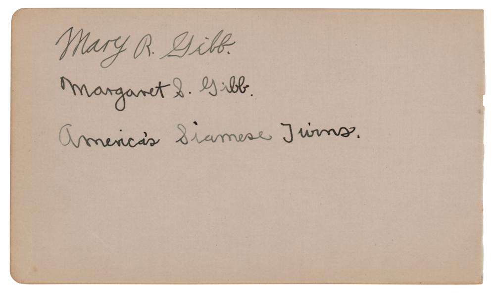 Vintage fountain pen signatures, "Mary R. Gibb" and "Margaret S. Gibb, America's Siamese Twins," on an off-white 6.25 x 3.75 album page. In fine condition.