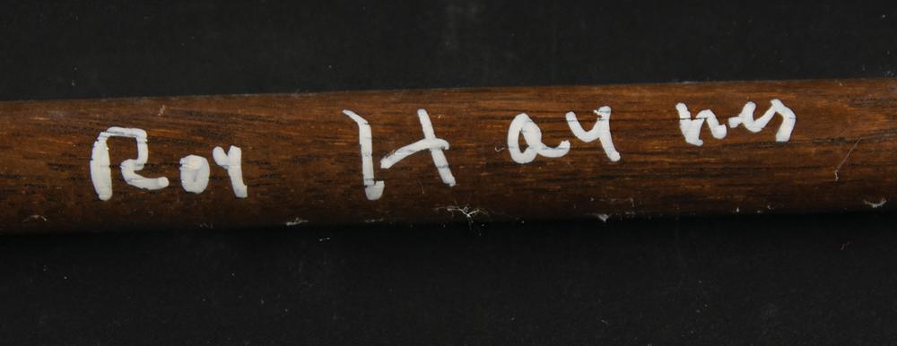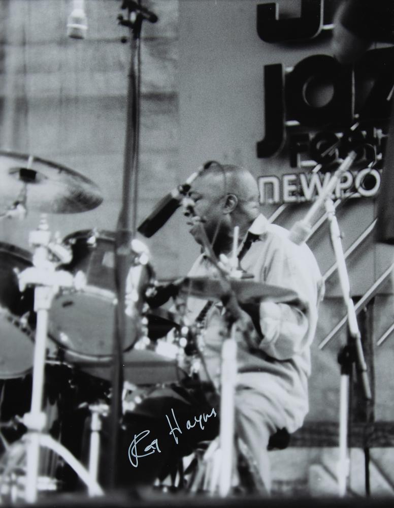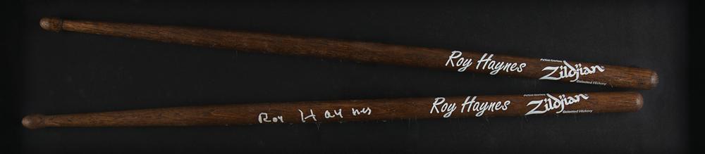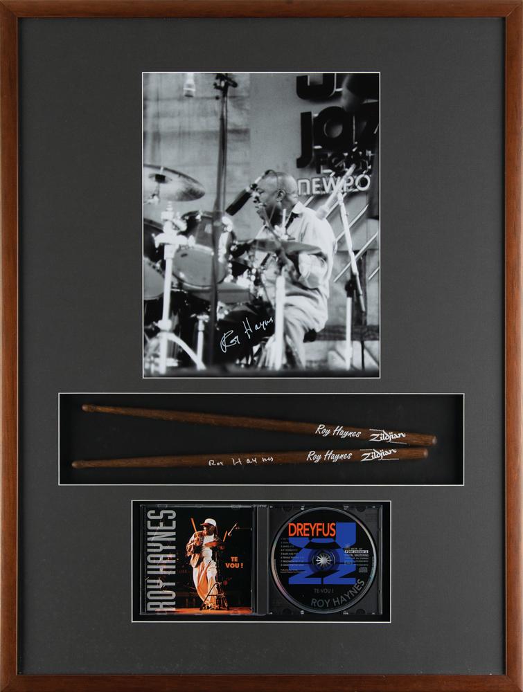 Prolific jazz drummer (born 1925) affiliated with icons like Lester Young, Charlie Parker, Thelonious Monk, Stan Getz, and Sarah Vaughan. Two items: a glossy 10.5 x 13.5 photo of Roy Haynes at his drum kit, signed in silver ink; and a pair of Roy Haynes-model Zildjian drum sticks, one of which is also signed in silver ink by Haynes. Nicely mounted, matted, and framed together with a CD to an overall size of 23 x 30.5. In fine condition.