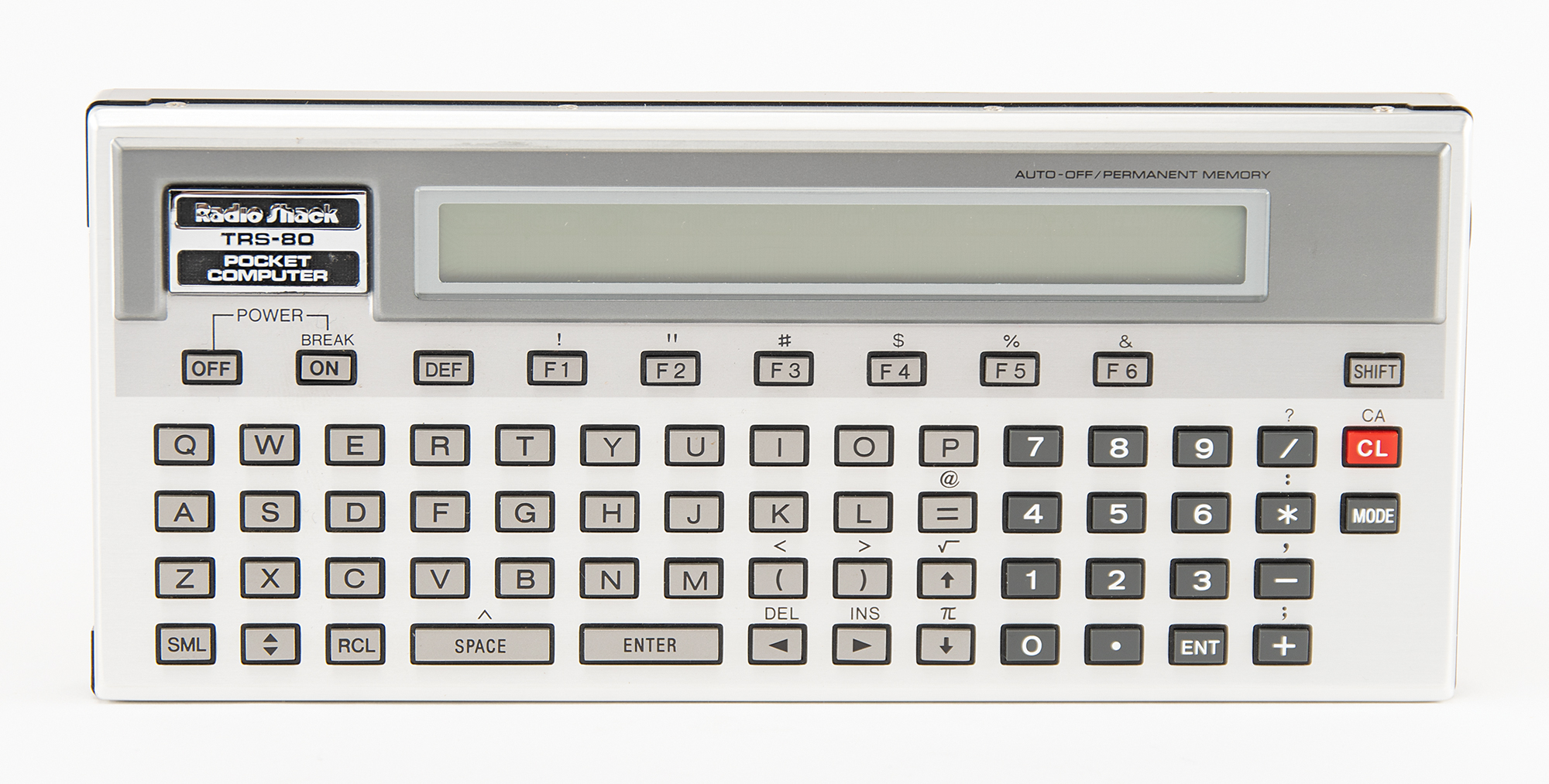 A TRS-80 Pocket Computer 2 (Catalog No. 26-3601), better known as the PC-2, which includes its original blue Radio Shack box, 10˝ x 7.25˝ x 2˝, and contains the PC-2’s black carrying poach and ring-bound owner’s manual. The back of the PC-2 is numbered “C1024433” and bears an affixed ownership label. The most powerful member of Radio Shack’s family of Pocket Computers, the PC-2 cost $279.95 when it was introduced in 1982 and it was the only Pocket Computer that had speed and memory capacity that was competitive with a contemporary desktop computer.