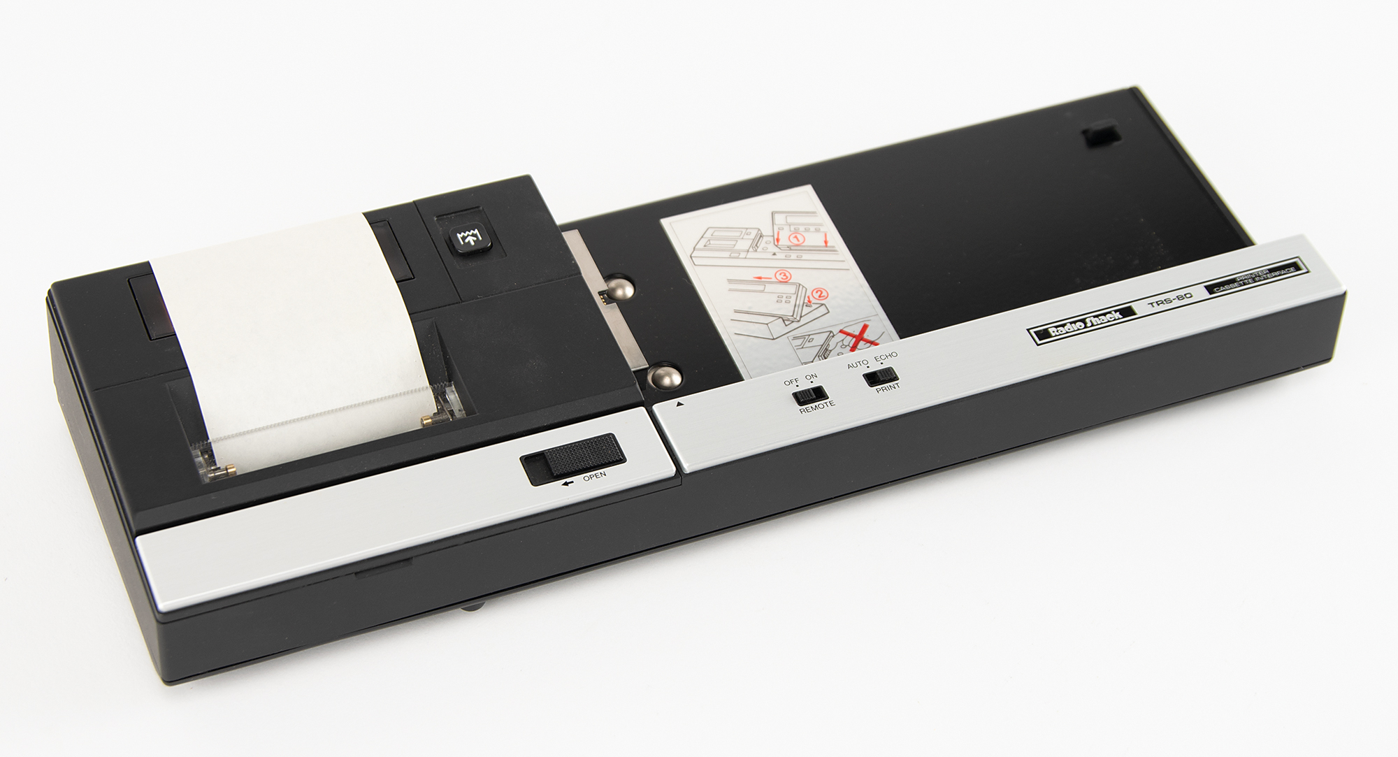 The Cassette/Printer Interface (Cat. No. 26-3605), which added 25 commands to PC-2 Extended Pocket BASIC to control the cassette and printer. Includes the original blue Radio Shack box, 16.25˝ x 9.25˝ x 3.25˝, which also contains an AC adapter charger, cables, ink cartridges, and printer sheets. Includes the owner’s manual. The bottom of the interface bears an affixed ownership label.