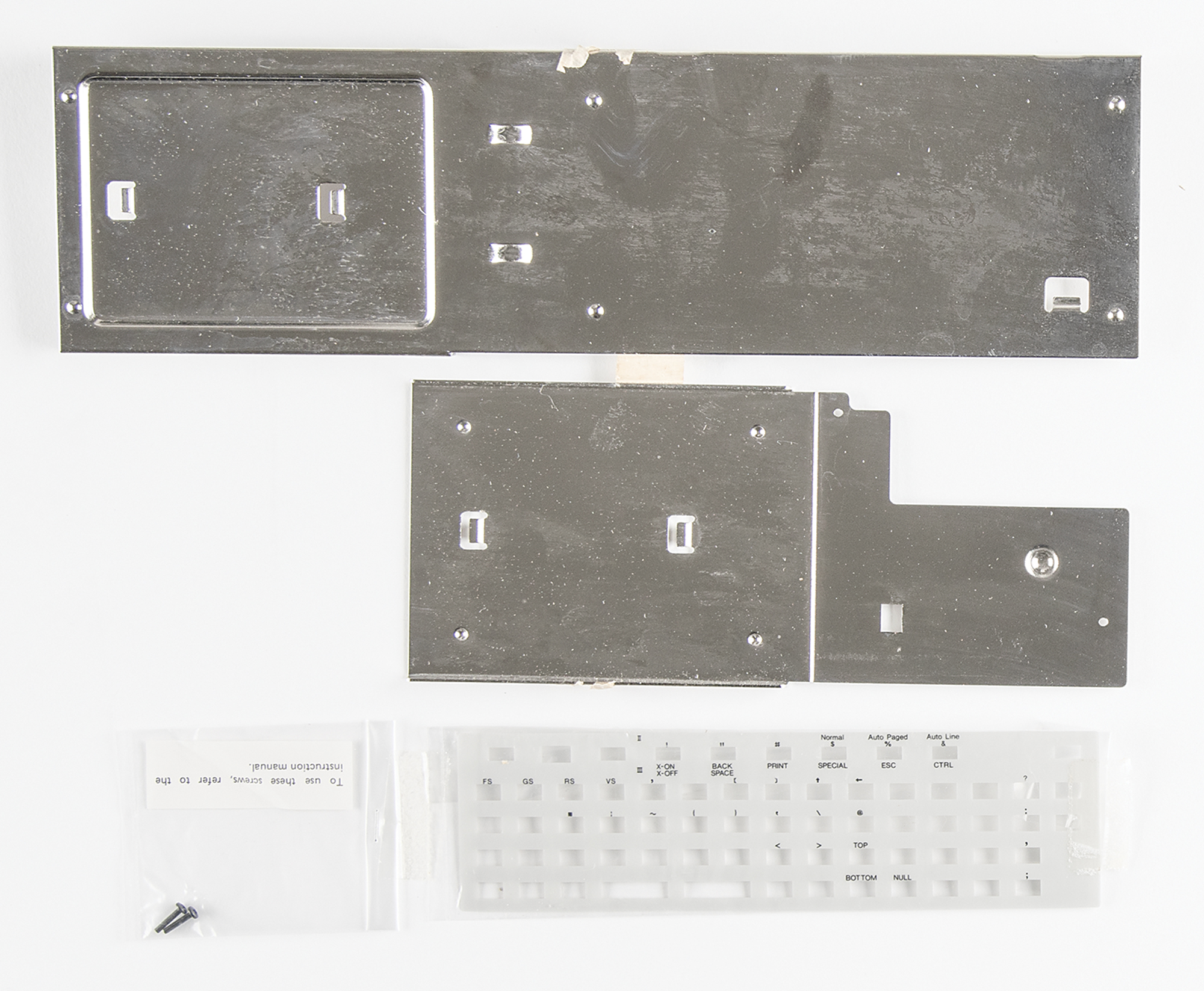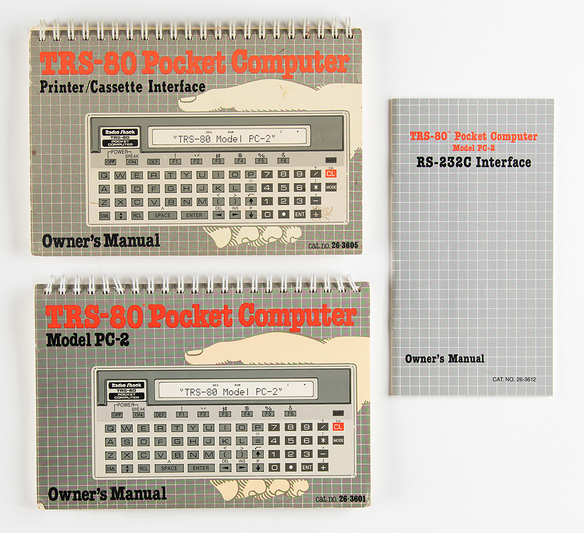 RS-232C Interface (Cat. No. 26-3612), which added commands to Extended Pocket BASIC to allow the PC-2 to connect to most RS-232 devices. Includes the original blue Radio Shack box, 13.25˝ x 5.75˝ x 4˝, which also contains an AC adapter charger, supporting connection brackets, and the owner’s manual. In overall fine and untested working condition; the box bears varying degrees of wear, including creases and some tears; the bottom of the P&C Interface box has been sealed with tape.