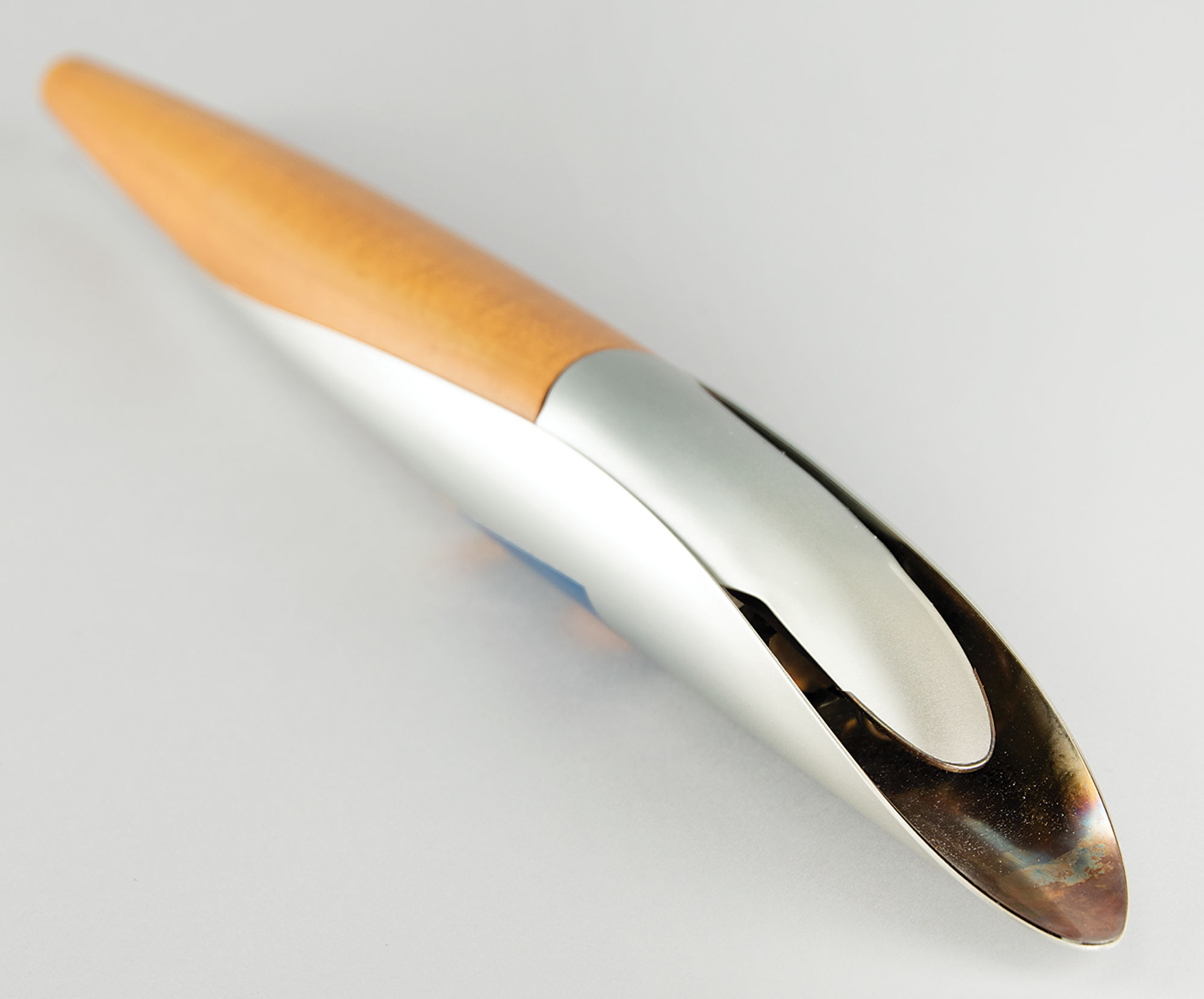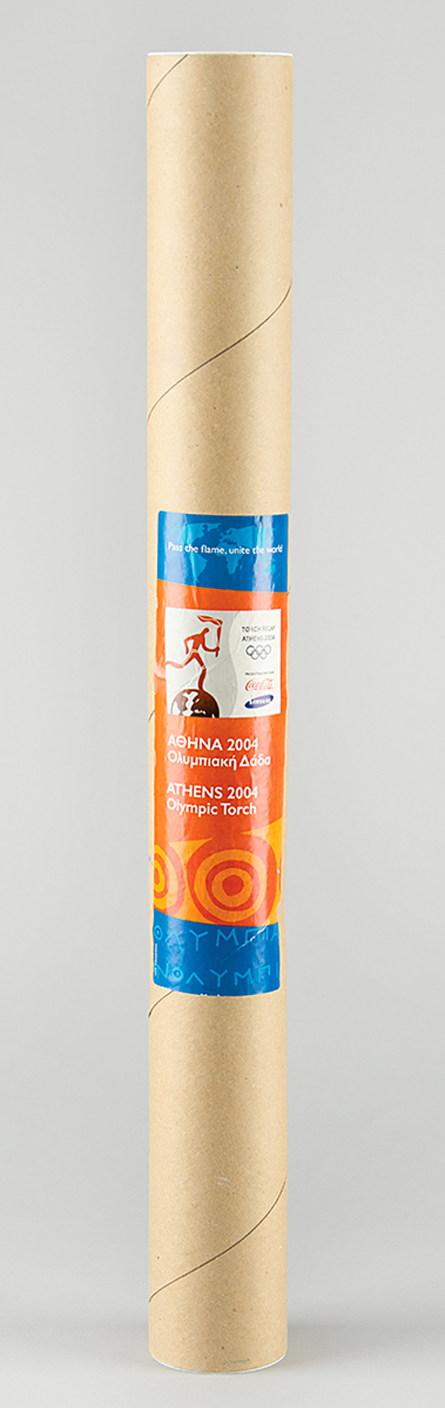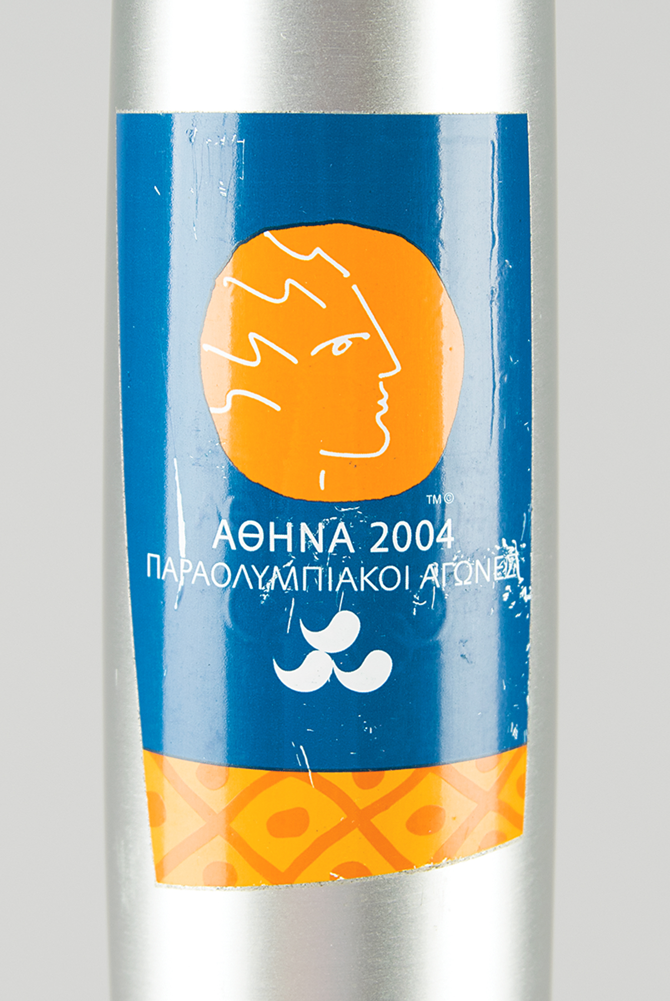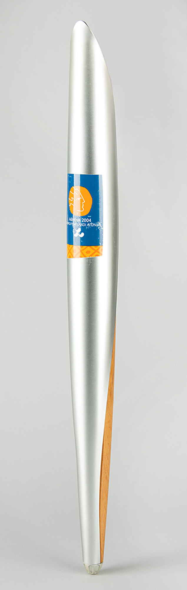 Official 2004 Athens Summer Paralympics torch, constructed of aluminum and olive wood, measuring 25.75″ in length and 2.25″ at its widest point, designed by Andreas Varotsos and manufactured by GA & L Harrington. The torch was modeled to reflect the simple and congruous lines of an olive tree leaf, with the union of wood and metal evoking the different colors found on either side of the leaf, and the ergonomic design representing the extension of the moving flame. The front of the aluminum sheath bears a label of the 2004 Paralympics emblem, which bears various scuffs and marks. The Olympic flame was lit in Olympia, Greece, on September 17, 2004, and a total of 705 torchbearers carried the Paralympics flame 410 km through 45 municipalities of Greece. This elegant torch includes its original shipping tube.
