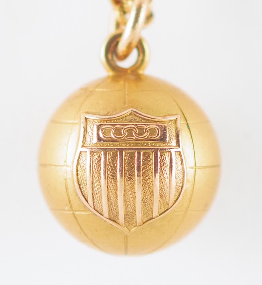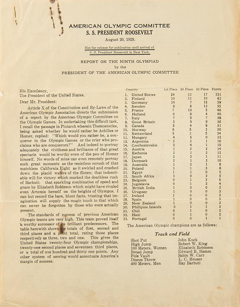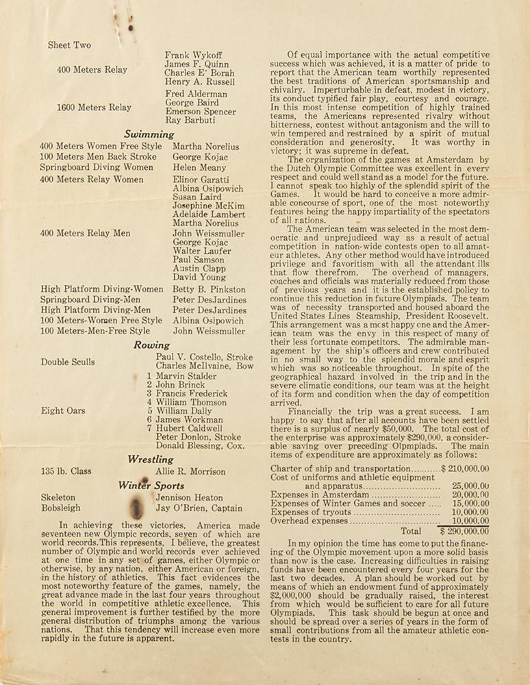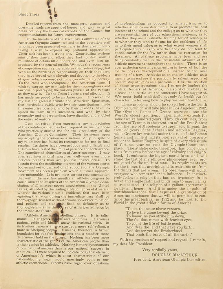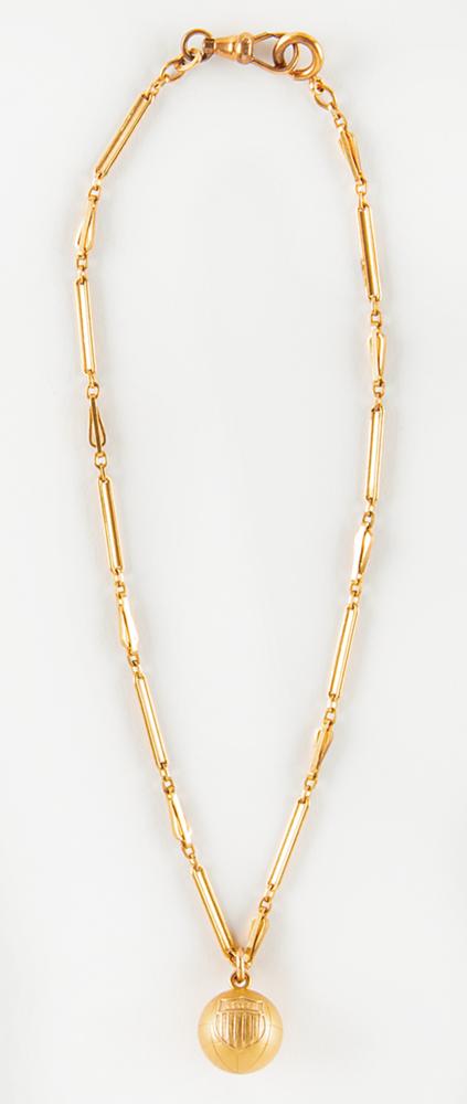 Small 14K gold charm given to members of the 1928 United States Olympic Team by General Douglas MacArthur, who served as the president of the American Olympic Committee. The charm, measuring approximately half an inch in diameter and weighing four grams, is in the shape of a globe and bears the US Olympic Team emblem on one side and the text, “Olympic Games, 1928,” on the other. The charm is suspended from a golden chain. Includes a three-page printed report by MacArthur covering the success of the United States at the Amsterdam 1928 Summer Olympics, proclaiming: "America made seventeen new Olympic records, seven of which are world records. This represents, I believe, the greatest number of Olympic and world records ever achieved at one time in any set of games, either Olympic or otherwise, by any nation." In fine condition, with scattered rust stains to the report.
