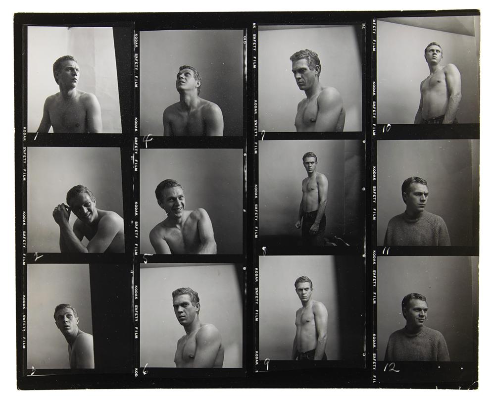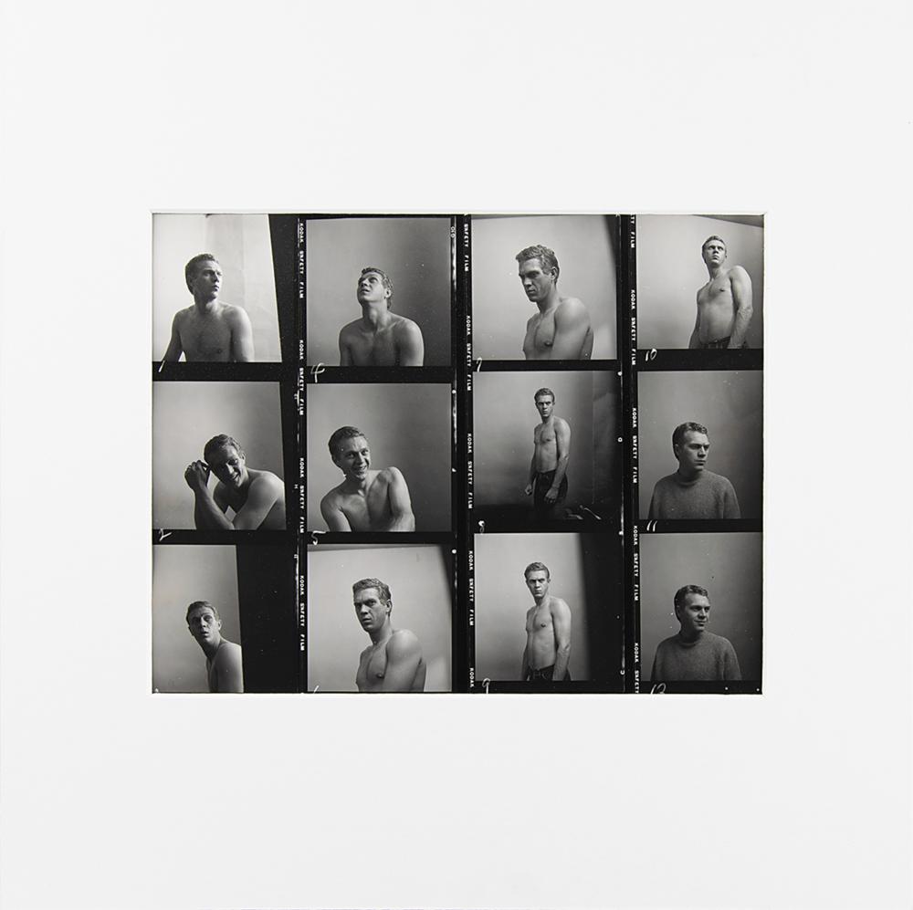 Original glossy 8 x 10 silver gelatin contact sheet featuring twelve images of Steve McQueen taken by photographer Roy Schatt in the mid-to-late 1950s: ten show the shirtless actor in a variety of poses, while two portray him in an attractive knit sweater. These photos were shot at shot at Roy Schatt's studio/apartment on 33rd Street in NYC. Reverse bears Roy Schatt credit stamps. Matted to an overall size of 14 x 14. In fine condition.