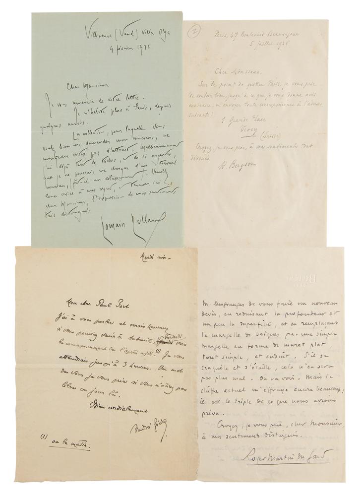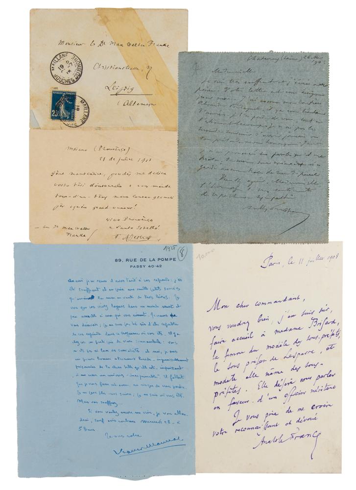 Eight ALSs by the first eight French winners of the Nobel Prize in Literature, including: Sully Prudhomme, Frederic Mistral, Romain Rolland, Anatole France, Henri Bergson, Roger Martin du Gard, Andre Gide, and Francois Mauriac. In overall very good to fine condition. A desirable, instant collection of French literary titans.