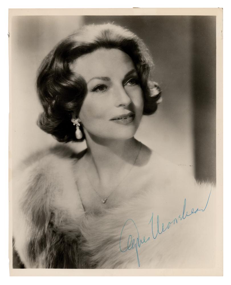Vintage glossy 8 x 10 photo of the award-winning actress early in her career, signed in blue ballpoint by Agnes Moorehead. The reverse dates the autograph to April 13, 1963. In fine condition, with light marks, and two dings to the left edge.