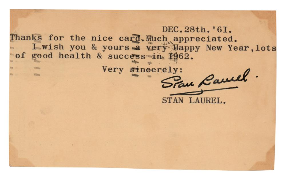 TLS on a 5 x 3 postal card, December 28, 1961. A brief letter from Stan Laurel to Emeline Koslik, in full: "Thanks for the nice card. Much appreciated. I wish you & yours a very Happy New Year, lots of good health & success in 1962." In fine condition, with toning to the corner tips and trimmed edges.