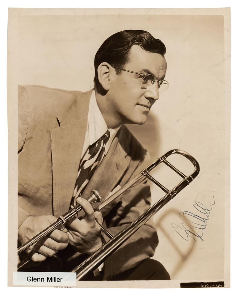 Vintage glossy 7.75 x 9.5 studio photo of Glenn Miller posing with his trombone, signed in black ink. The lower left corner bears an affixed name caption. In very good to fine condition, with trimmed edges, and scattered creasing, some of which touch Miller's face.