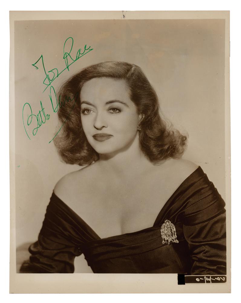 Vintage glossy 7.75 x 10 studio photo of the Oscar-winning actress in an elegant bust-length pose signed and inscribed in green fountain pen, "For Rae, Bette Davis.” Collector's notation to the reverse dates the autograph to September 15, 1960. In fine condition, with trimmed edges and scattered light creasing.