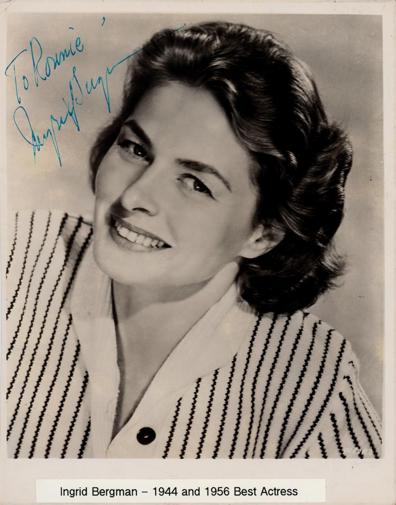Vintage glossy 8 x 10 studio photo of the three-time Oscar-winning actress in a close-up pose, signed and inscribed in bright blue fountain pen, "To Ronnie, Ingrid Bergman.” The lower border bears an affixed name caption. In very good to fine condition, with lightly trimmed borders, scattered small creases, and a larger crease to the lower left.