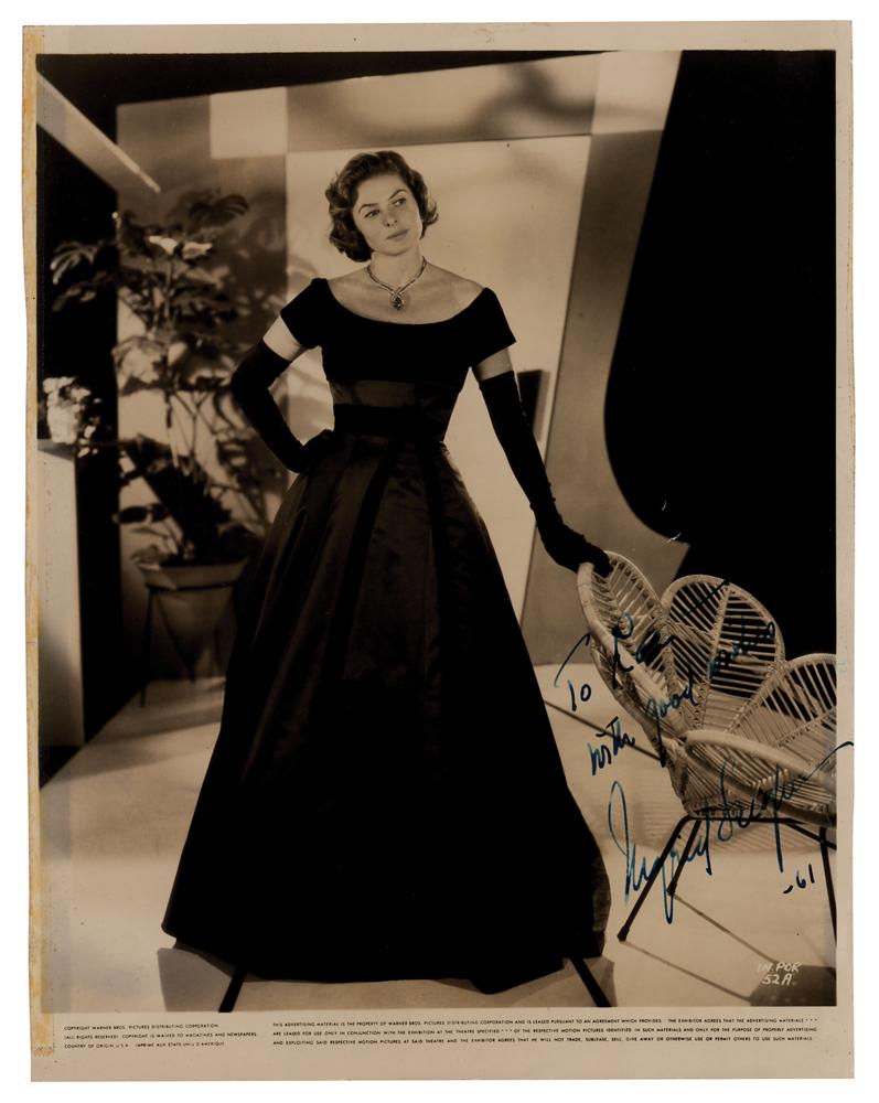 Vintage glossy 7.75 x 10 Warner Bros. publicity photo of the three-time Oscar-winning actress wearing a dark dress in an elegant full-length pose, signed and inscribed in fountain pen, "To Rae—with good wishes, Ingrid Bergman, -61.” Ink notations to the reverse date the autograph to January 1961. In very good to fine condition, with scattered light creasing, light rippling, and old tape stains to the lightly trimmed borders.