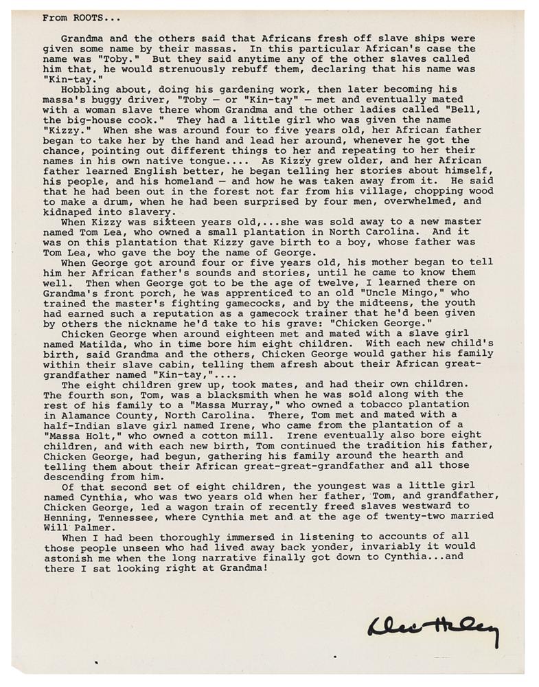 Souvenir typescript from his classic novel Roots, one page, 8.5 x 11, signed at the bottom in black felt tip, "Alex Haley." The excerpt begins: "Grandma and the others said that Africans fresh off slave ships were given some name by their massas. In this particular African's case the name was 'Toby.' But they said anytime any of the other slaves called him that, he would strenuously rebuff them, declaring that his name was 'Kin-tay.'" In fine condition, with trivial loss to one corner tip.