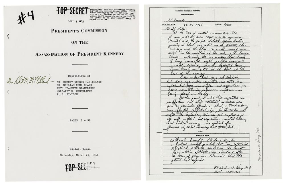 Two items: photocopy of pages 1-22 of Dr. Robert McClelland's deposition before the Warren Commission, originally labeled as "Top Secret," 8.5 x 11, signed on the cover sheet in black felt tip, "Dr. Robert N. M. McClelland"; and a facsimile copy of Dr. Malcolm O. Perry's notes on his examination of John F. Kennedy, 8.5 x 11, signed in the margin in black ballpoint, "Malcolm O. Perry, M.D." This year marks the 60th anniversary of the assassination of President Kennedy and these two doctors treated him at Parkland Hospital. In overall fine condition.