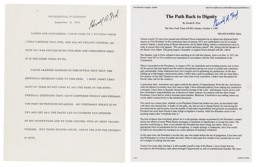 Two souvenir typescripts, 8.5 x 11, each signed in felt tip, "Gerald R. Ford." Includes: an eight-page copy of the presidential statement delivered upon pardoning Richard Nixon on September 8, 1974; and a two-page printout of his New York Times op-ed entitled "The Path Back to Dignity," regarding the impeachment of President Clinton, published on October 4, 1998. In fine condition.