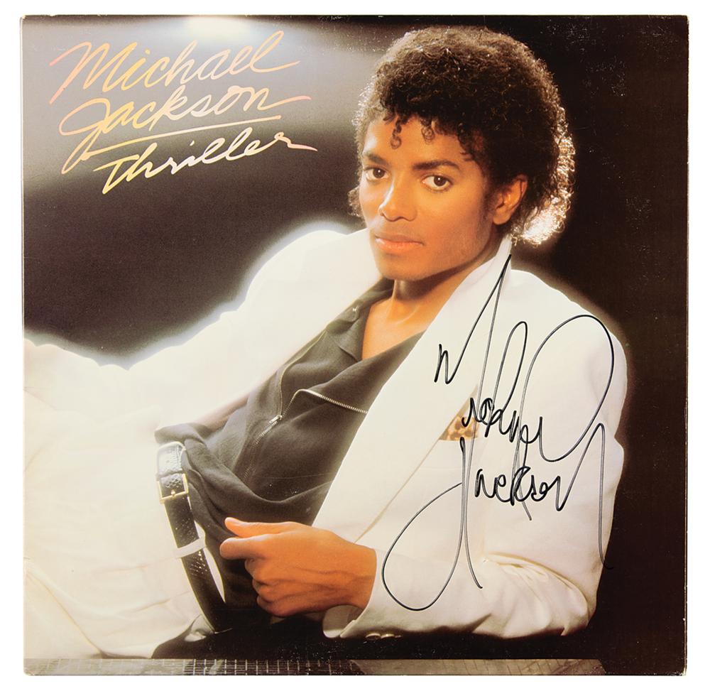 Thriller album (gilt-stamped "For Promotion Only" on the reverse) signed prominently on the front cover in black felt tip, "Michael Jackson." In fine condition. The record is included. A superior example of this sought-after title.