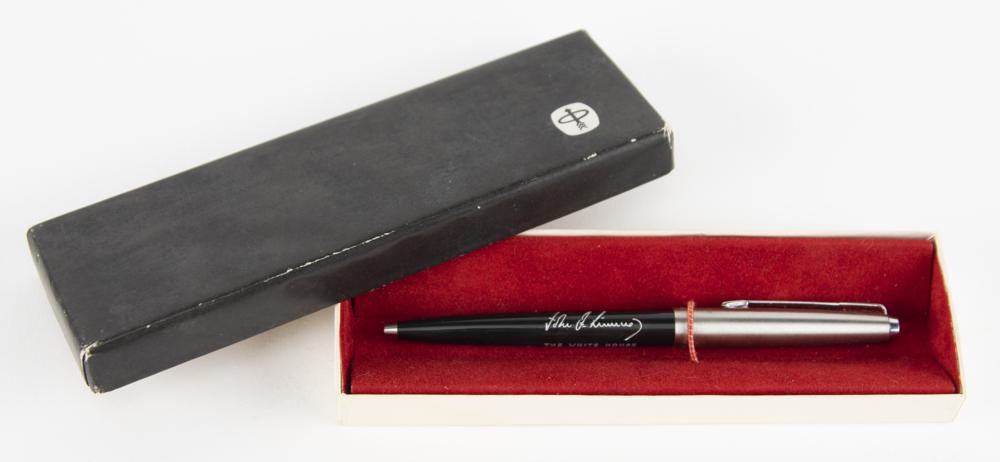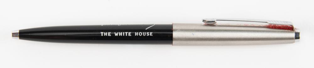 Desirable black Parker 45 cap-activated ballpoint pen designed to be given as a White House gift by President John F. Kennedy, engraved on the side in silver with "The White House" below JFK's facsimile signature. Includes the original box, and retains an ink cartridge within the pen. In fine condition.
