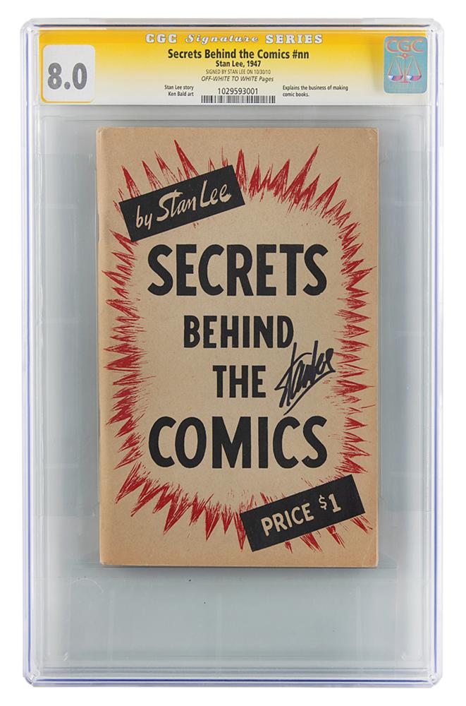Graded by CGC Signature Series 8.0 (Off-White to White Pages). Secrets Behind the Comics by Stan Lee issued in 1947, 5.5 x 8.5, signed on the front cover in black felt tip. Featuring a story by Stan Lee with art by Ken Bald, the comic explains the business of making comic books. Scarce and sought-after even unsigned, this is one of only just seven examples graded by CGC at this level or higher. Accompanied by the original ticket stub from Stan Lee's signing at the Detroit FanFare in 2010, as well as an exhibitor's pass from the event.
