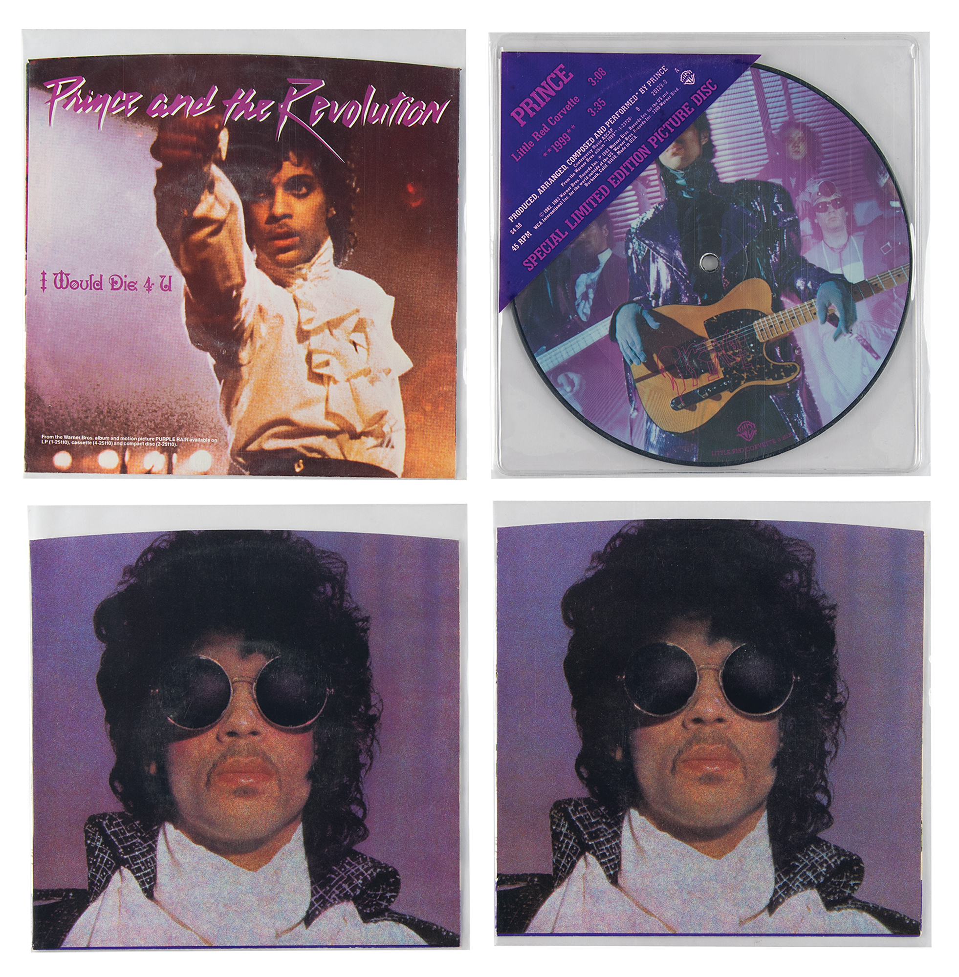 Collection of vinyl records from the '1999' and 'Purple Rain' eras of the early 1980s, including: three limited edition 12˝ maxi-singles of 'Purple Rain' pressed on purple vinyl, all in their original shrinkwrap (one slit open at the top); a 12˝ maxi-single of 'Let's Go Crazy'; Prince's 1999 double-vinyl LP (sealed in its original shrinkwrap, with discount punch to upper left); three 7˝ singles of 'When Doves Cry'; a 7˝ single of 'I Would Die 4 U'; and a 7˝ limited edition picture disc single of 'Little Red Corvette.' Additionally includes a scarce original "Prince" record store cassette rack flag, and promo postcards of Sheila E. and Morris Day. In overall fine condition.