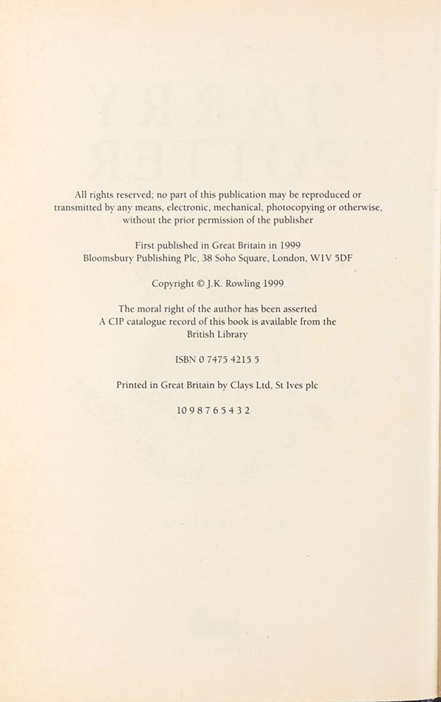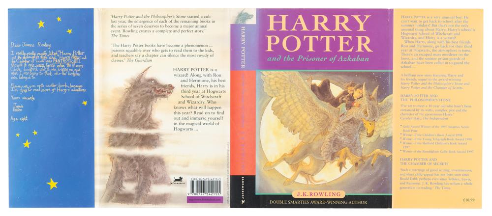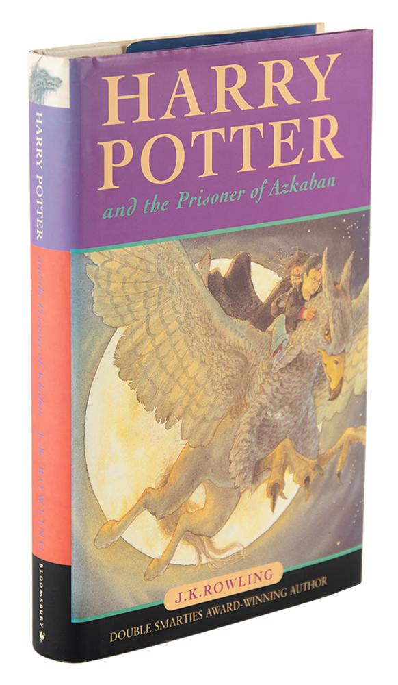 Signed book: Harry Potter and the Prisoner of Azkaban. Second printing. London: Bloomsbury, 1999. Hardcover with dust jacket, 5.5 x 8, 317 pages. Signed on the dedication page in black ballpoint, "J. K. Rowling." Autographic condition: fine. Book condition: VG+/VG, with slight sunning to the jacket's spine. A highly desirable early edition of the third Harry Potter book, nicely signed by its author.