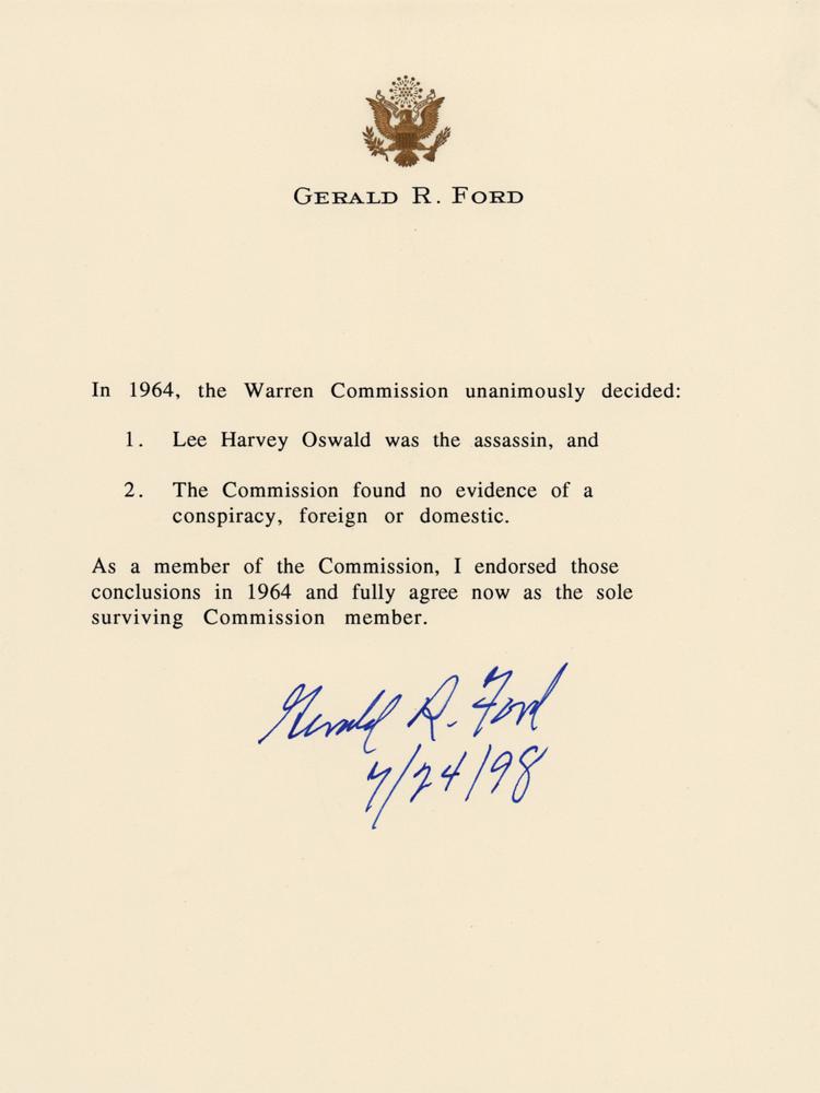 Souvenir typescript on an off-white 6.25 x 8.5 sheet of personal letterhead with an embossed presidential eagle, signed in blue felt tip, "Gerald R. Ford, 7/24/98." The statement, which regards the findings of the Warren Commission following the assassination of President John F. Kennedy, in full: "In 1964, the Warren Commission unanimously decided: 1. Lee Harvey Oswald was the assassin, and 2. The Commission found no evidence of a conspiracy, foreign or domestic. As a member of the Commission, I endorsed those conclusions in 1964 and fully agree now as the sole surviving Commission member." In very fine condition.